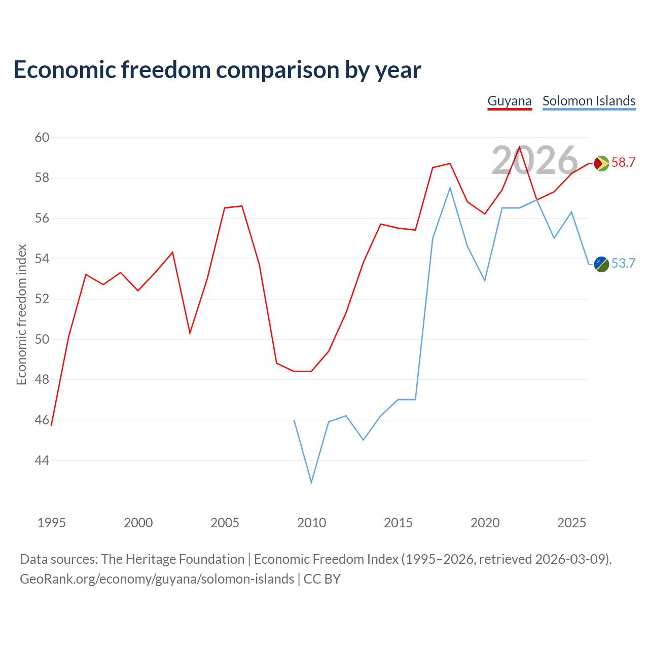 The Economic Freedom Index for Guyana is 58.7, ranking 109/197, compared to 53.7 for the Solomon Islands, ranking 137/197. The chart above displays a comparison of annual changes in economic freedom indexes.