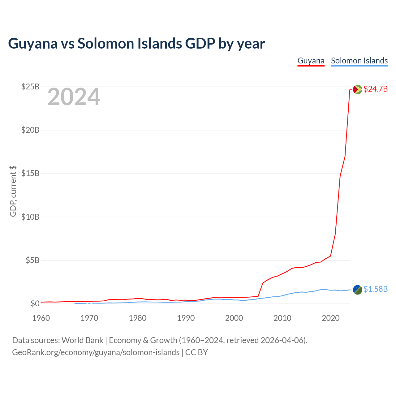 Guyana has a GDP of $24.7B compared to $1.58B for the Solomon Islands, ranking 120/197 and 182/197 by economy size, respectively.