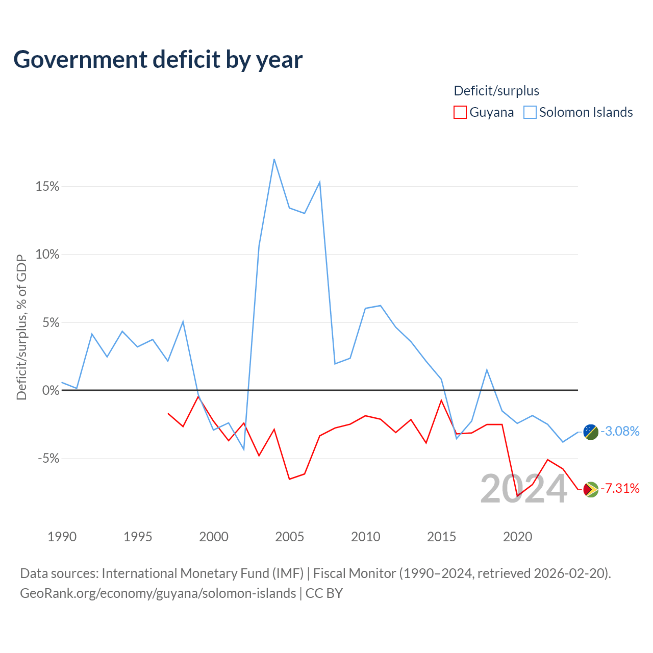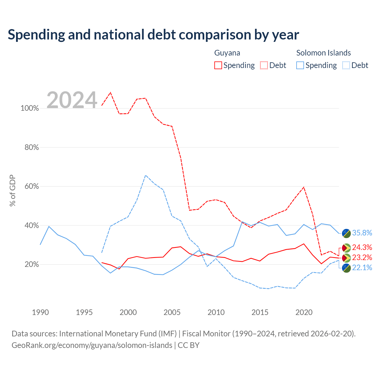 Guyana has $5.99B in government debt (24.3% of GDP), compared to $350M (22.1% of GDP) in the Solomon Islands.