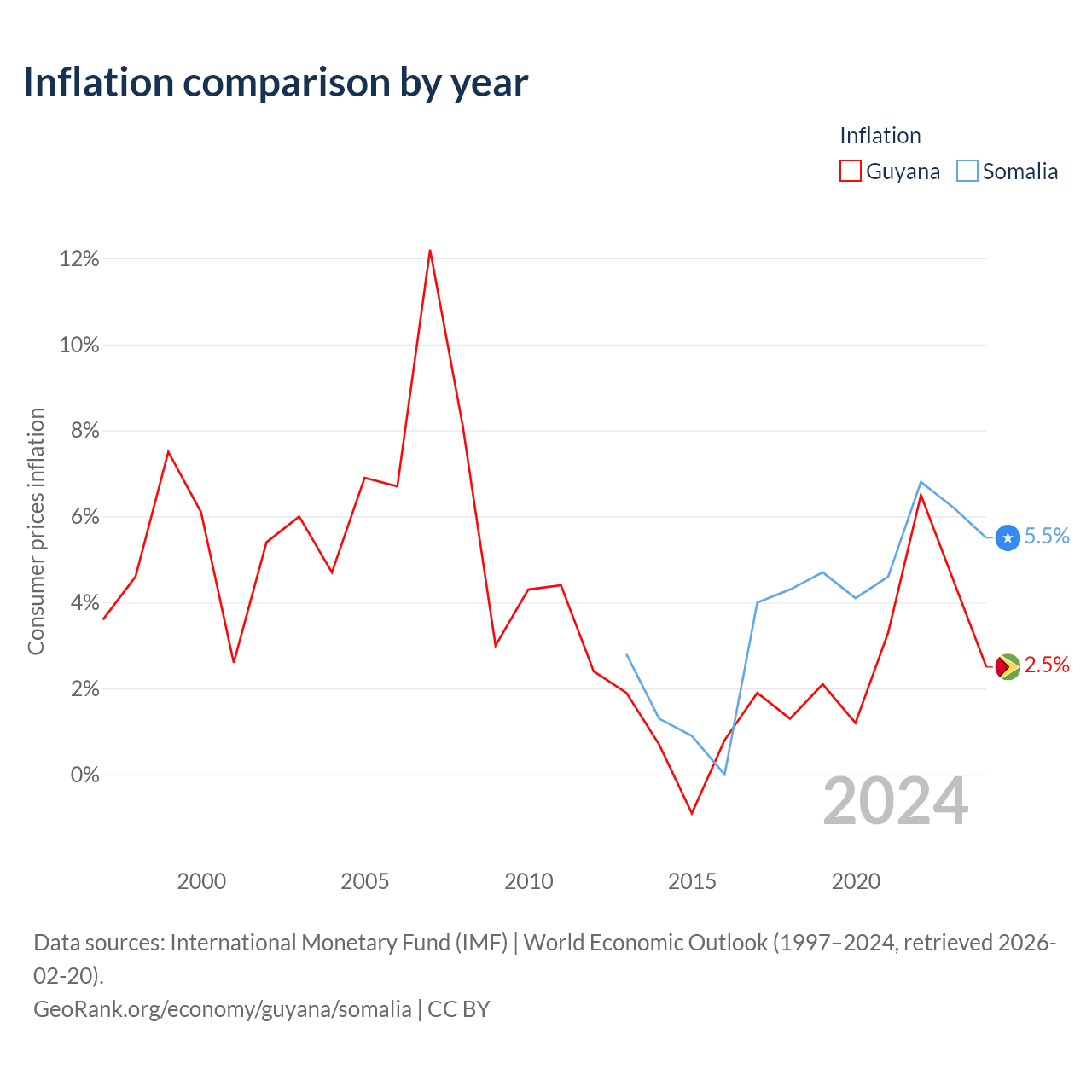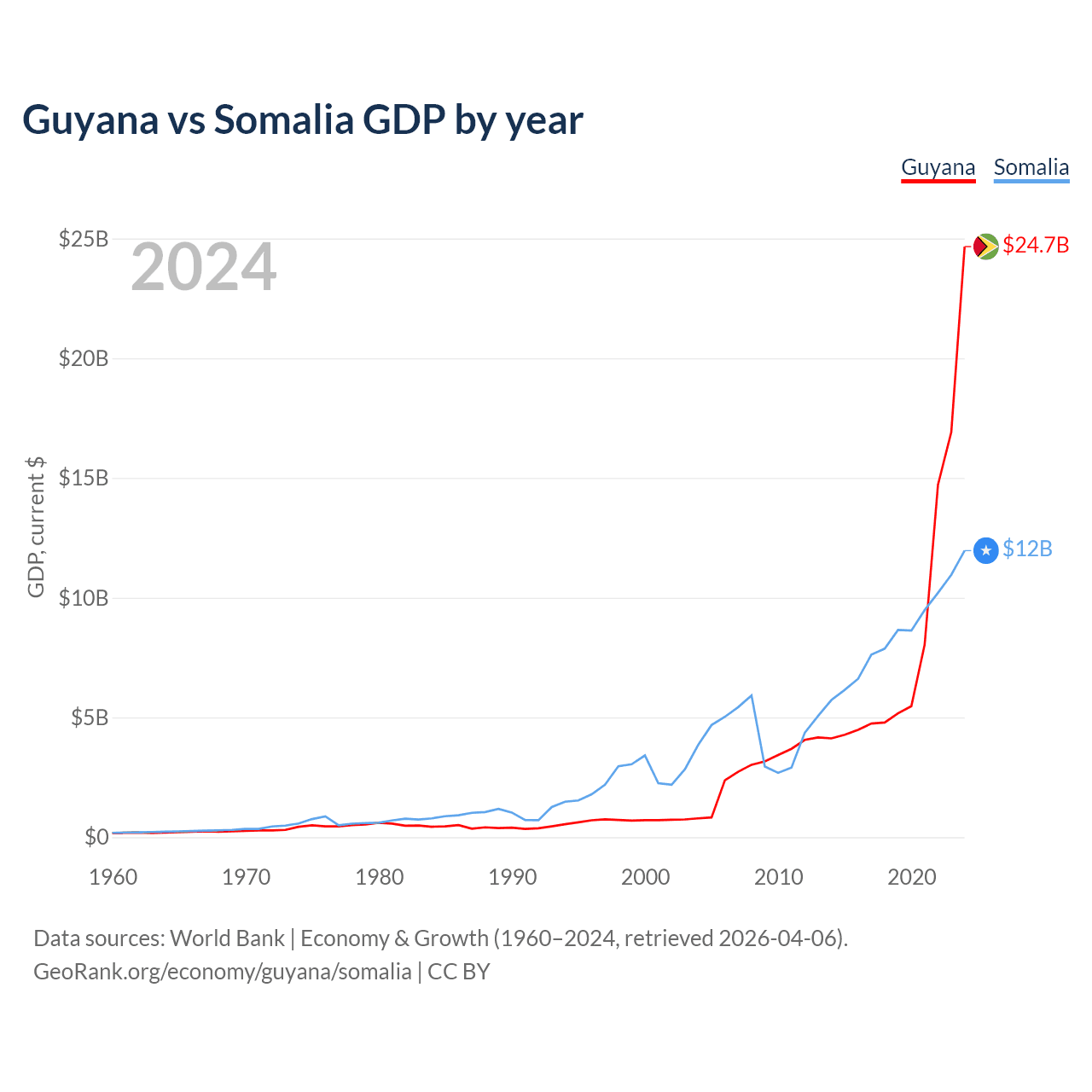 Guyana has a GDP of $24.7B compared to $12B for Somalia, ranking 120/197 and 150/197 by economy size, respectively.