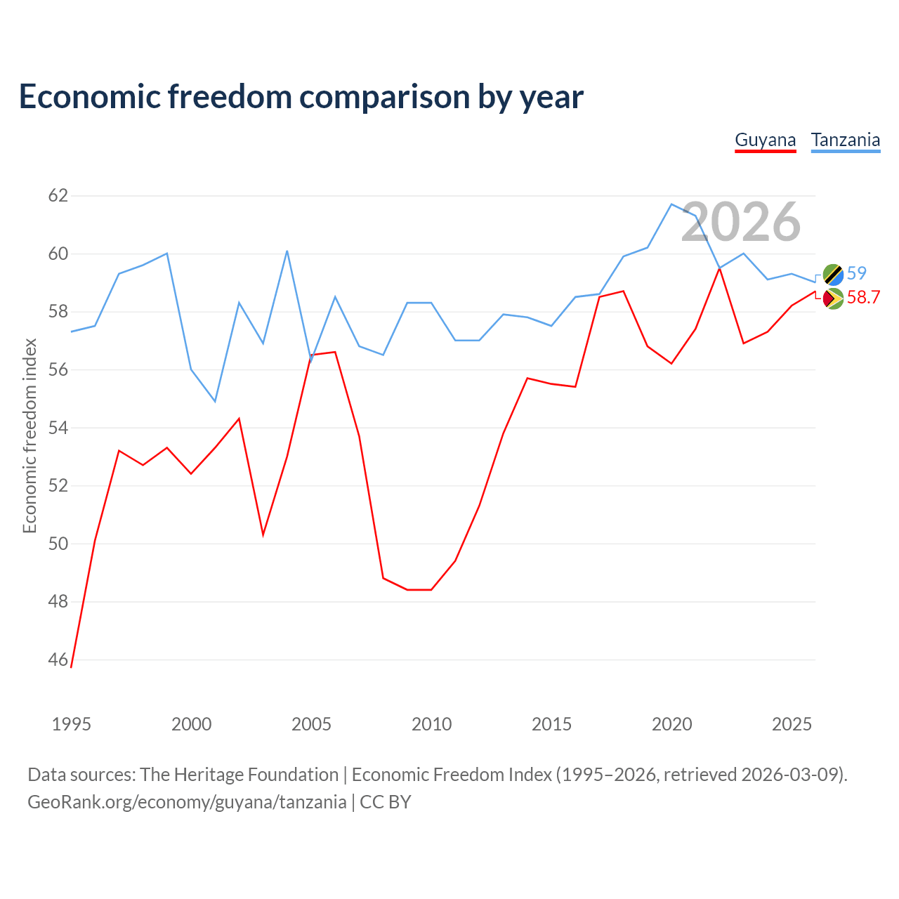 The Economic Freedom Index for Guyana is 58.7, ranking 109/197, compared to 59 for Tanzania, ranking 106/197. The chart above displays a comparison of annual changes in economic freedom indexes.