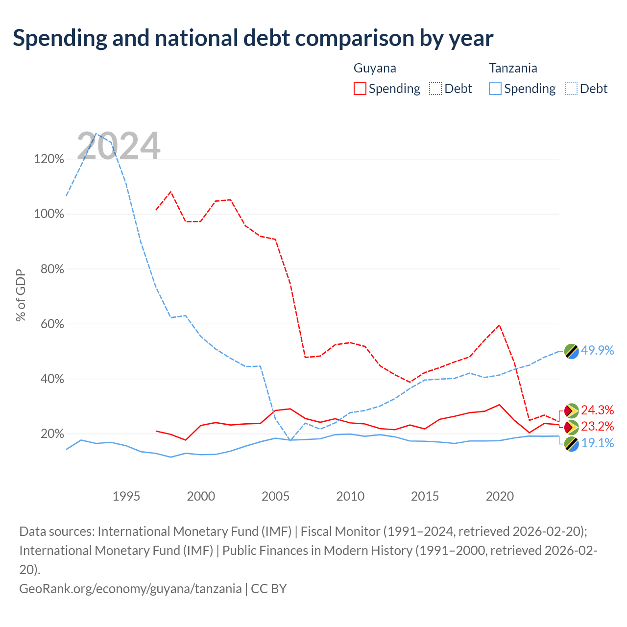 Guyana has $5.99B in government debt (24.3% of GDP), compared to $39.3B (49.9% of GDP) in Tanzania.