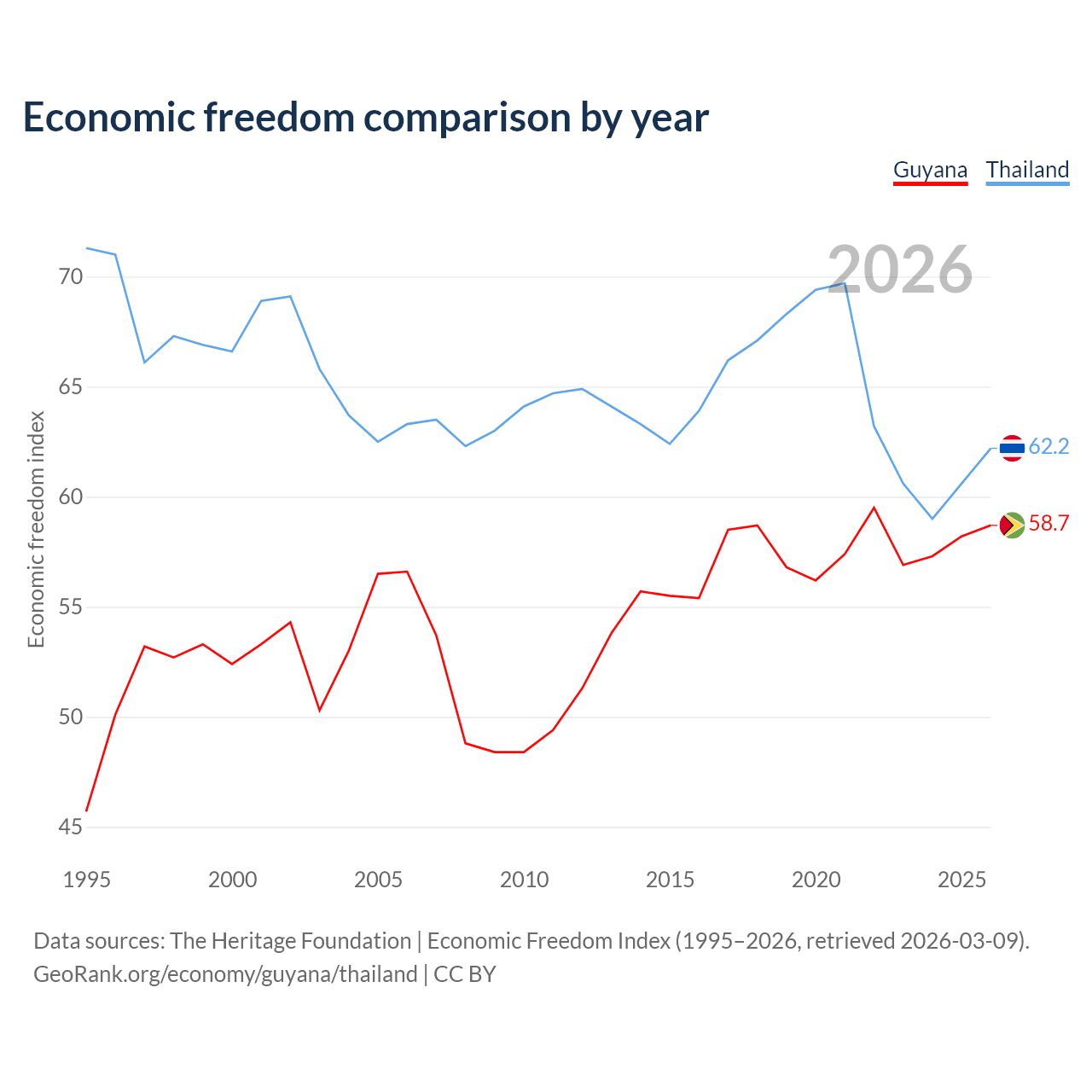 The Economic Freedom Index for Guyana is 58.7, ranking 109/197, compared to 62.2 for Thailand, ranking 88/197. The chart above displays a comparison of annual changes in economic freedom indexes.