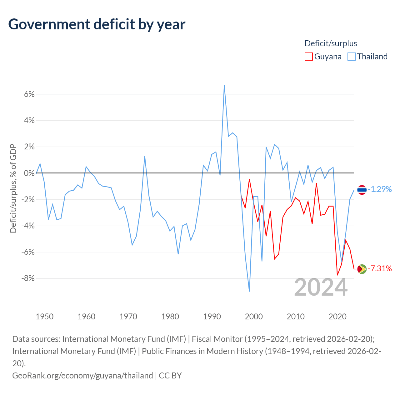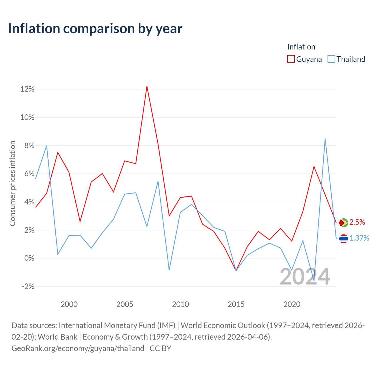 Guyana has a GDP of $24.7B compared to $527B for Thailand, ranking 120/197 and 31/197 by economy size, respectively.