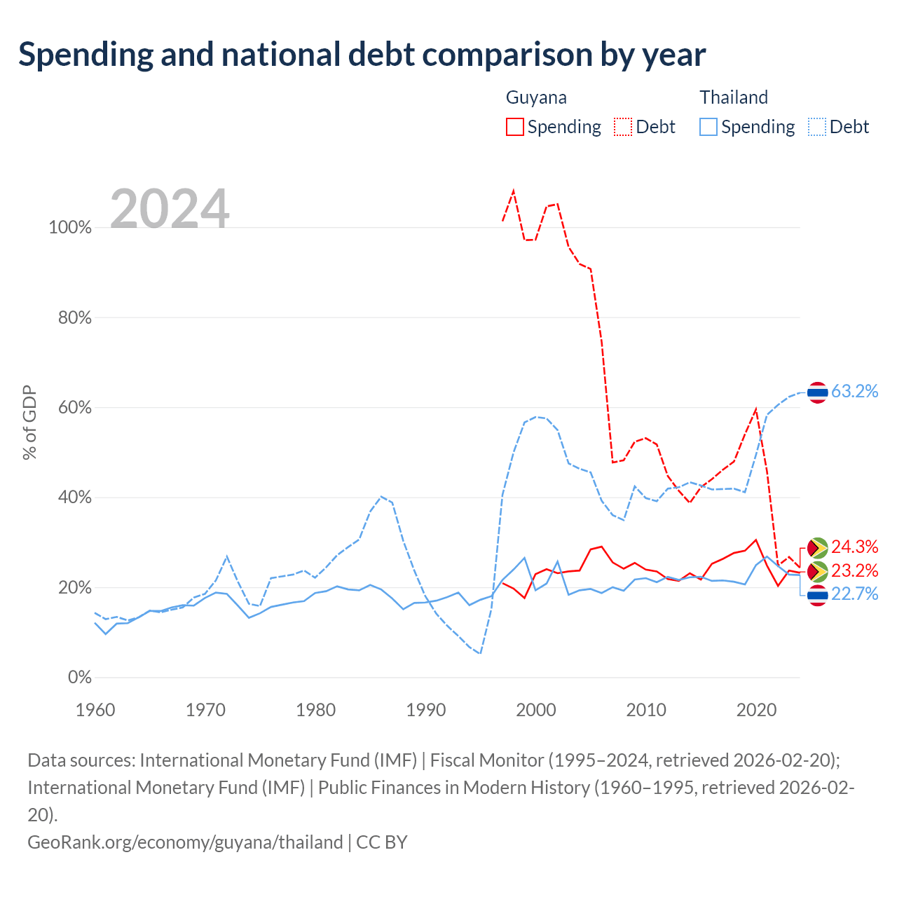 Guyana has $5.99B in government debt (24.3% of GDP), compared to $333B (63.2% of GDP) in Thailand.