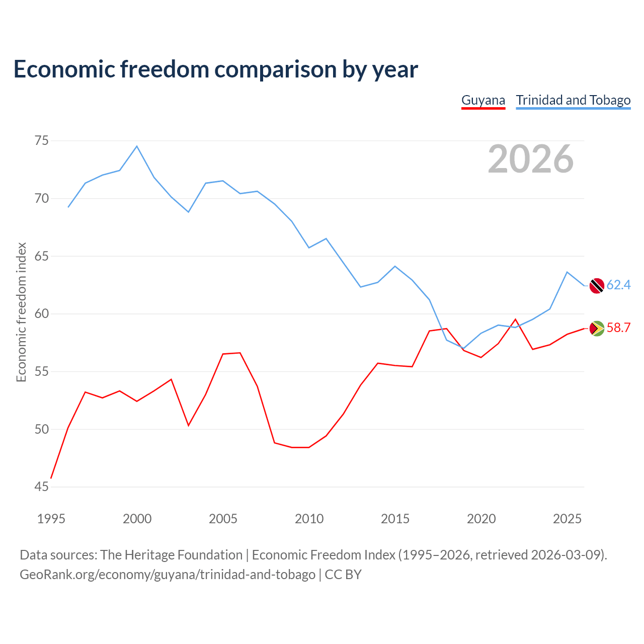 The Economic Freedom Index for Guyana is 58.7, ranking 109/197, compared to 62.4 for Trinidad and Tobago, ranking 87/197. The chart above displays a comparison of annual changes in economic freedom indexes.