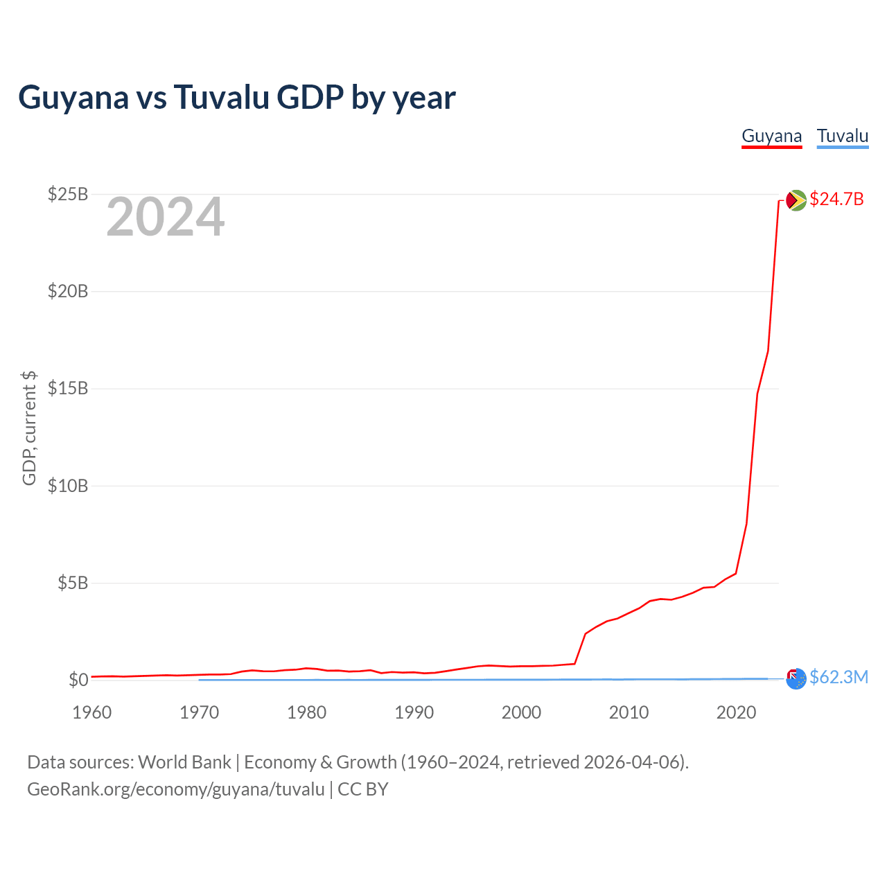 Guyana has a GDP of $24.7B compared to $62.3M for Tuvalu, ranking 120/197 and 196/197 by economy size, respectively.