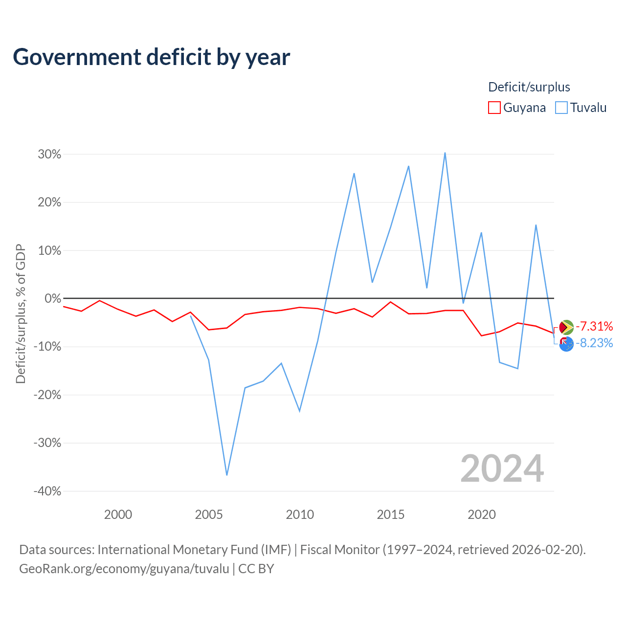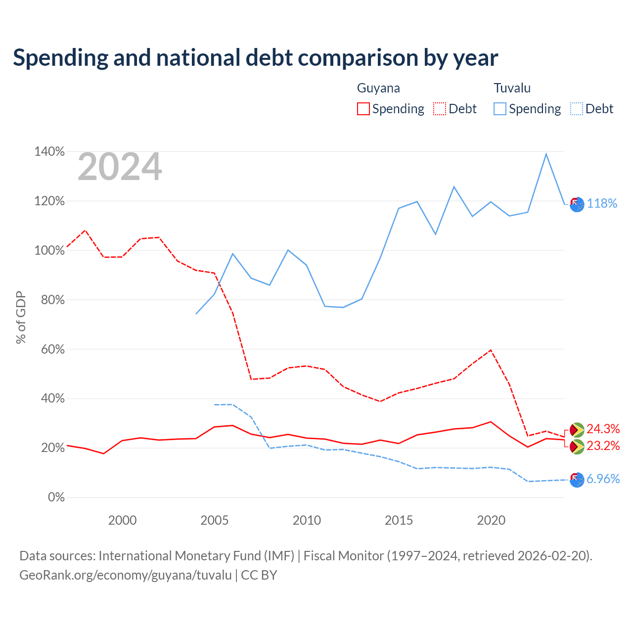 Guyana has $5.99B in government debt (24.3% of GDP), compared to $4.15M (6.96% of GDP) in Tuvalu.