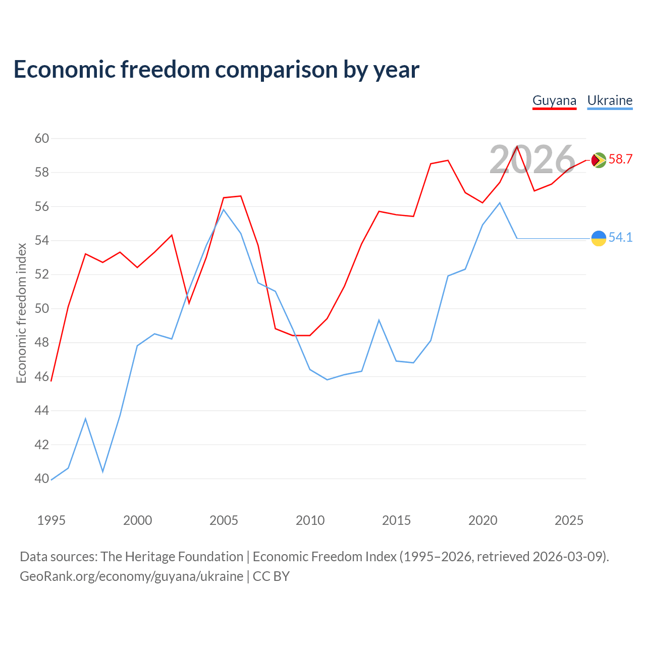 The Economic Freedom Index for Guyana is 58.7, ranking 109/197, compared to 54.1 for Ukraine, ranking 135/197. The chart above displays a comparison of annual changes in economic freedom indexes.