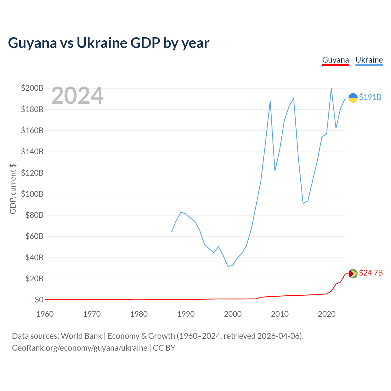 Guyana has a GDP of $24.7B compared to $191B for Ukraine, ranking 120/197 and 57/197 by economy size, respectively.