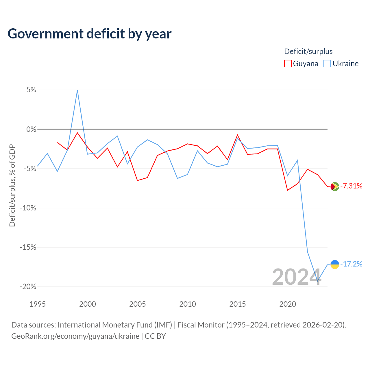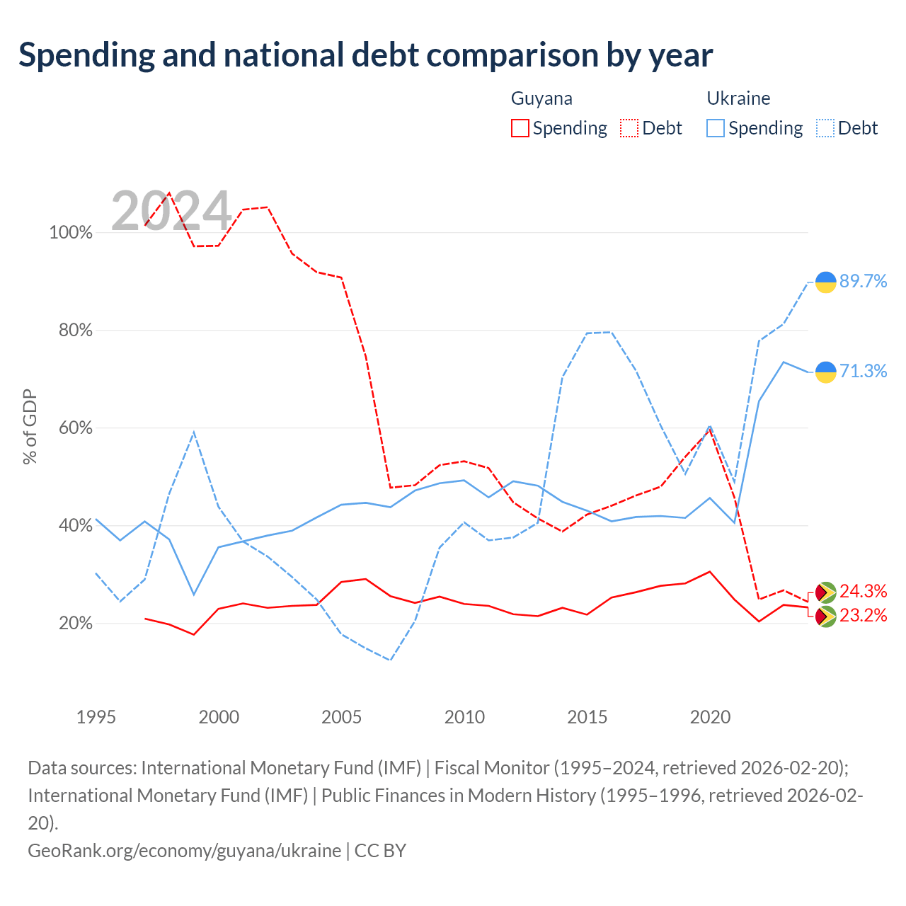 Guyana has $5.99B in government debt (24.3% of GDP), compared to $171B (89.7% of GDP) in Ukraine.