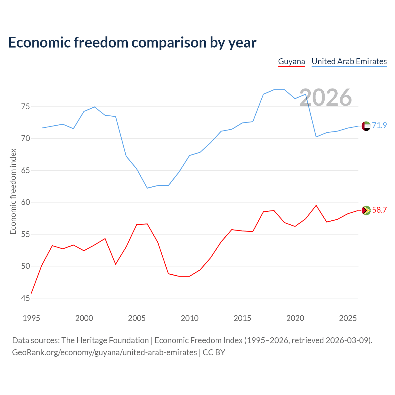 The Economic Freedom Index for Guyana is 58.7, ranking 109/197, compared to 71.9 for the United Arab Emirates, ranking 29/197. The chart above displays a comparison of annual changes in economic freedom indexes.
