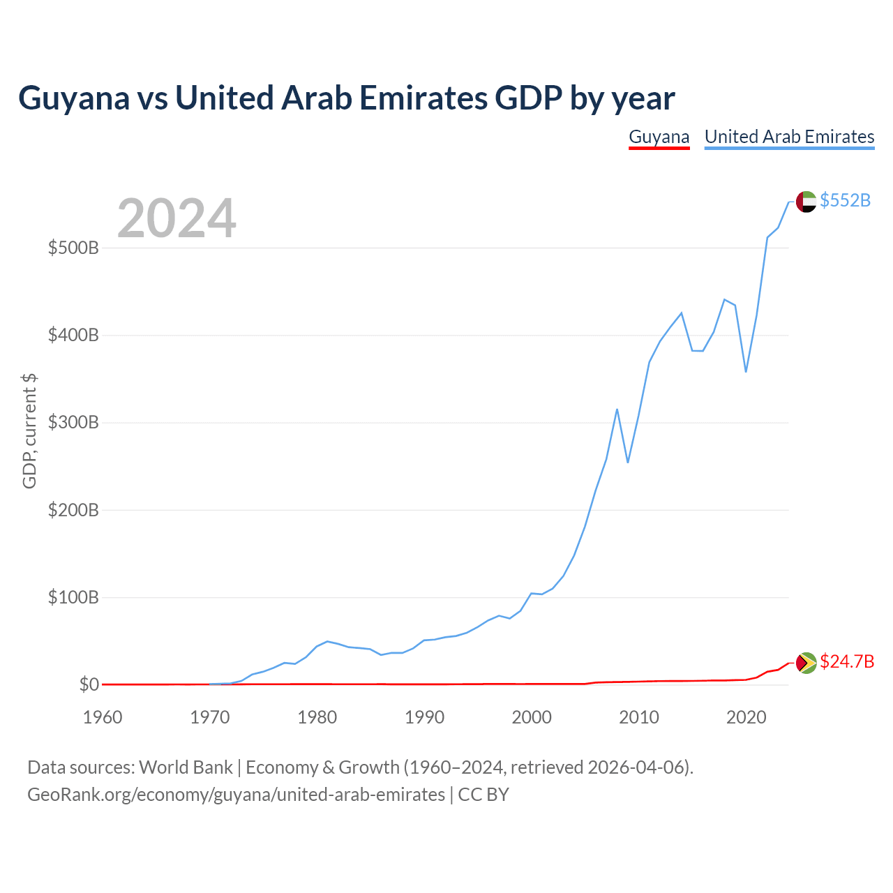 Guyana has a GDP of $24.7B compared to $552B for the United Arab Emirates, ranking 120/197 and 27/197 by economy size, respectively.