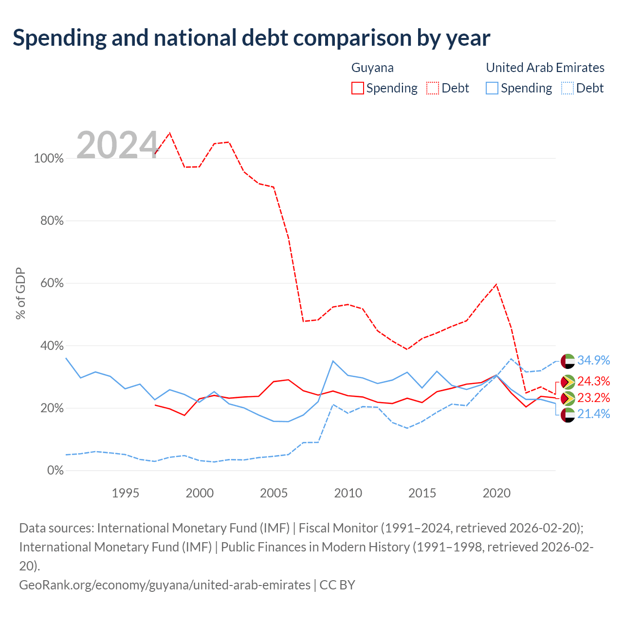 Guyana has $5.99B in government debt (24.3% of GDP), compared to $193B (34.9% of GDP) in the United Arab Emirates.