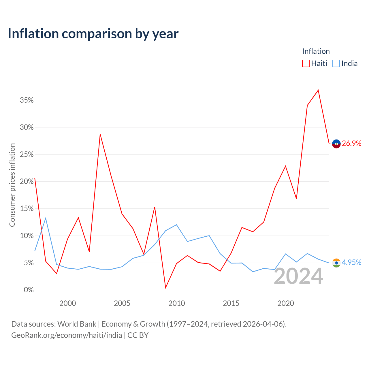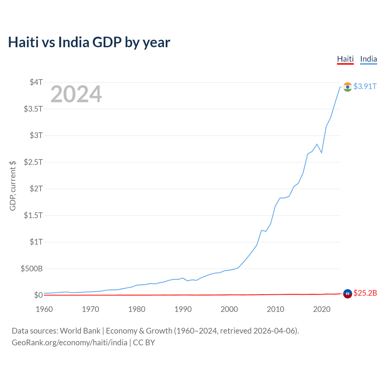 Haiti has a GDP of $25.2B compared to $3.91T for India, ranking 117/197 and 5/197 by economy size, respectively.