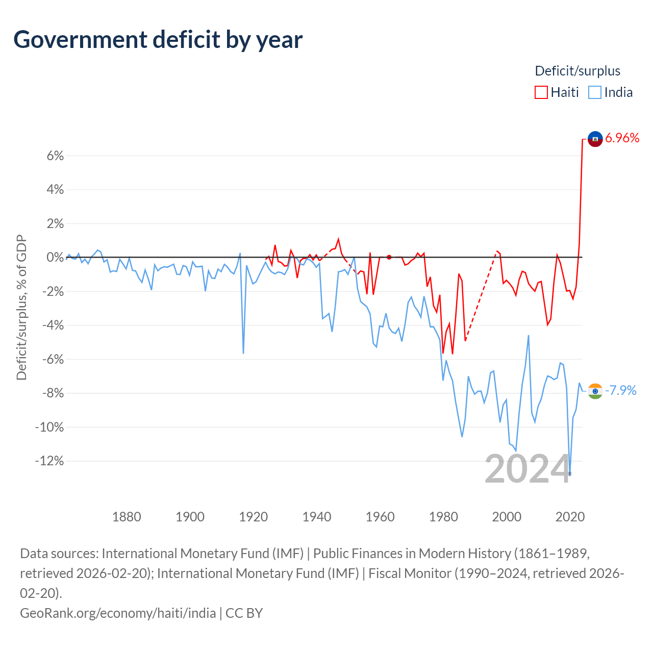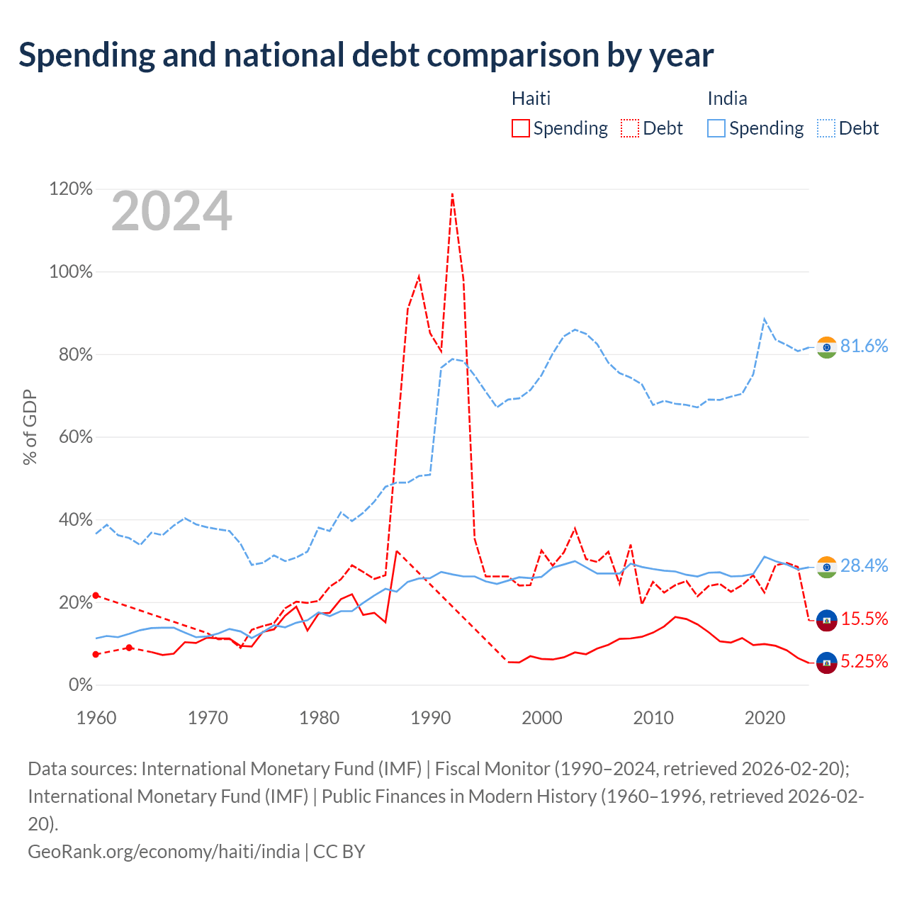 Haiti has $3.91B in government debt (15.5% of GDP), compared to $3.19T (81.6% of GDP) in India.