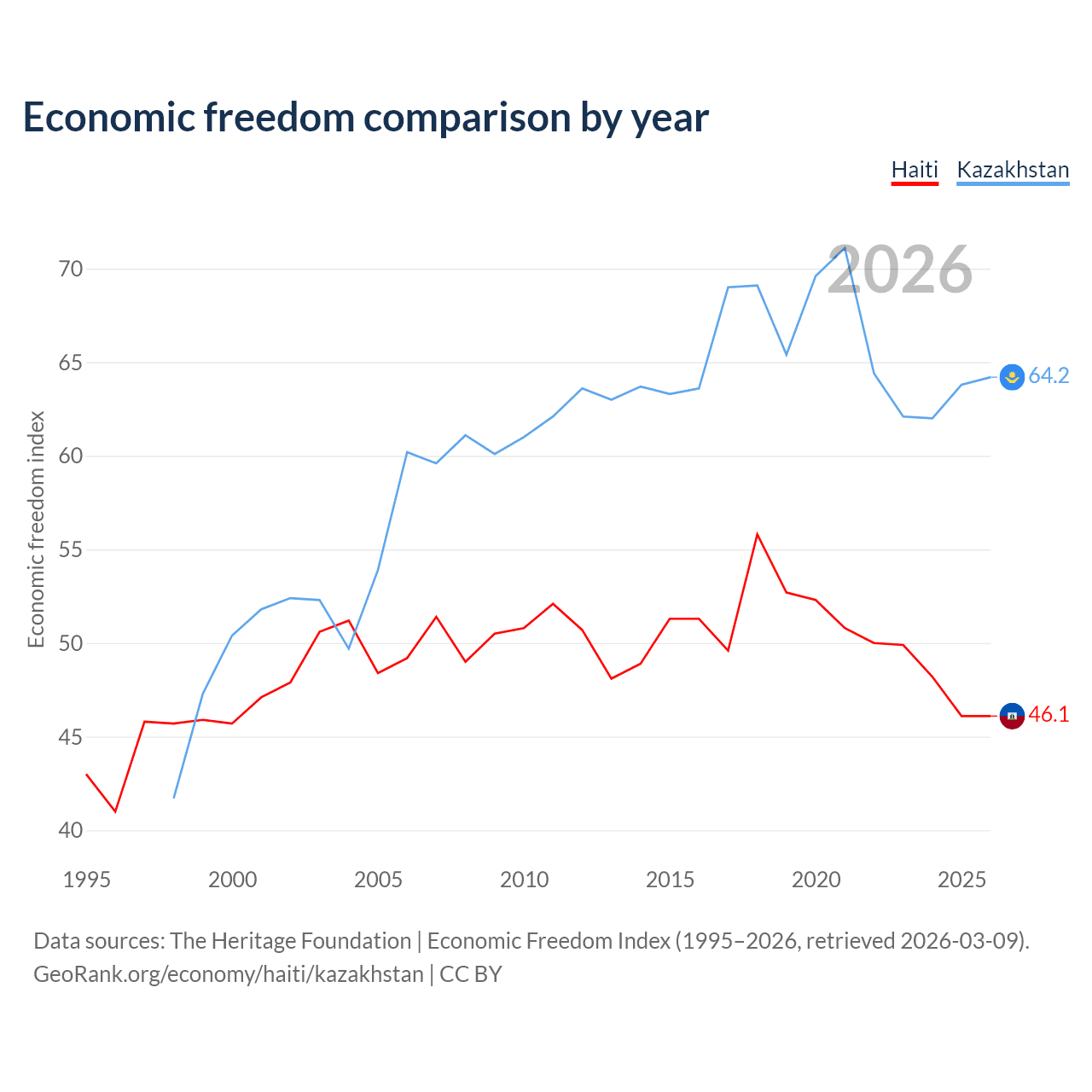 The Economic Freedom Index for Haiti is 46.1, ranking 178/197, compared to 64.2 for Kazakhstan, ranking 75/197. The chart above displays a comparison of annual changes in economic freedom indexes.