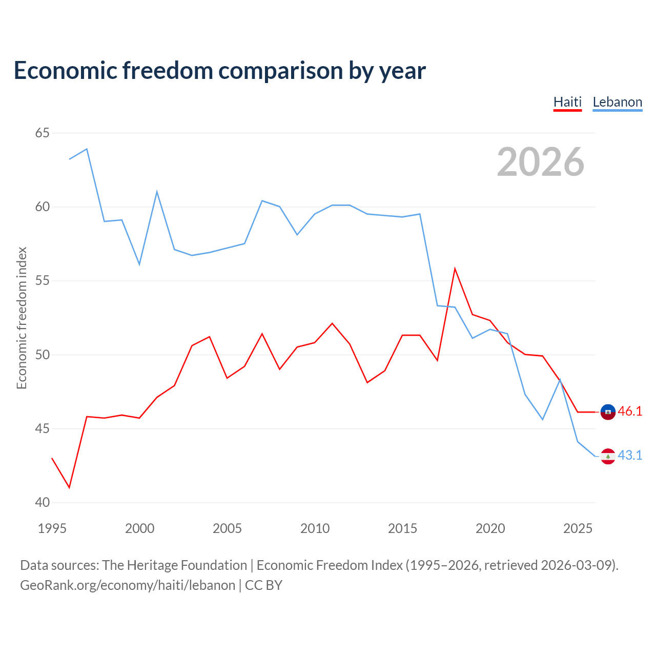 The Economic Freedom Index for Haiti is 46.1, ranking 178/197, compared to 43.1 for Lebanon, ranking 183/197. The chart above displays a comparison of annual changes in economic freedom indexes.