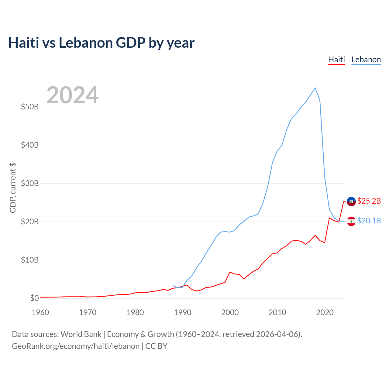 Haiti has a GDP of $25.2B compared to $20.1B for Lebanon, ranking 117/197 and 128/197 by economy size, respectively.
