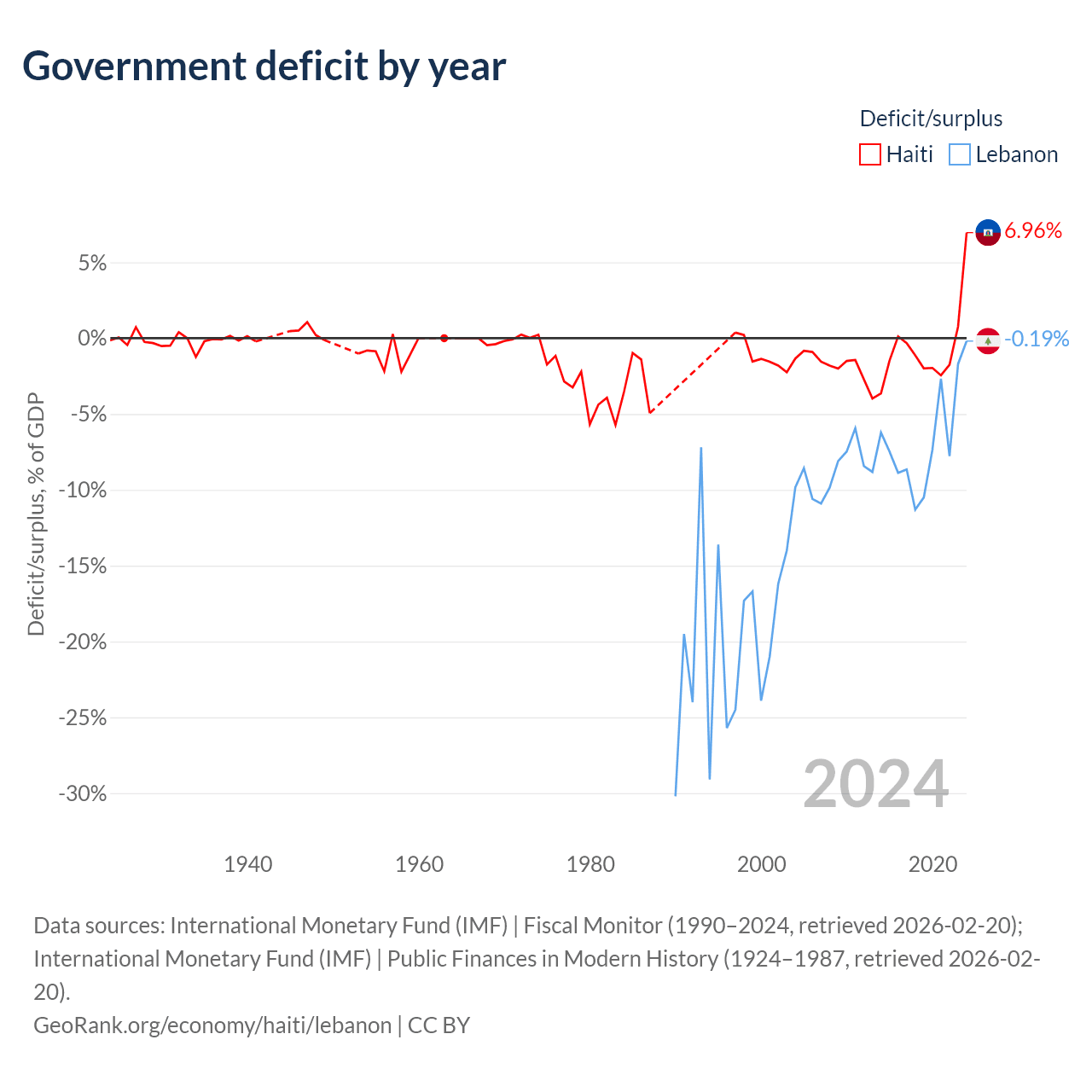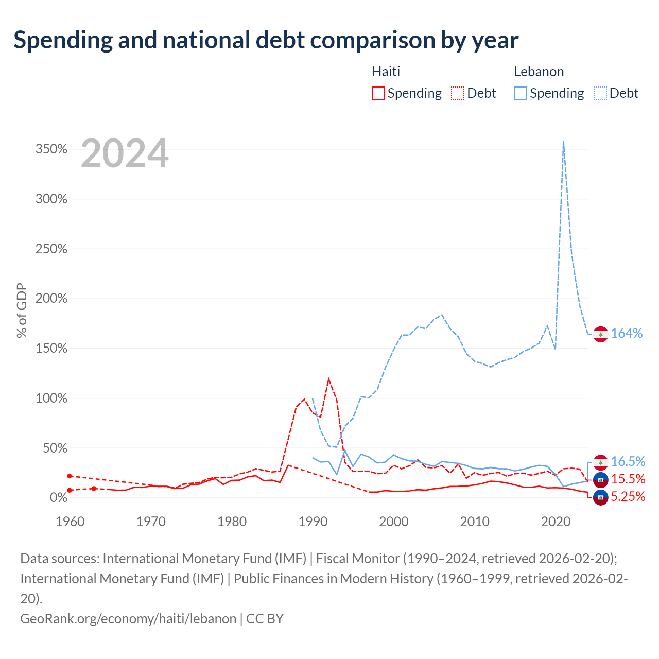 Haiti has $3.91B in government debt (15.5% of GDP), compared to $38.7B (163.8% of GDP) in Lebanon.