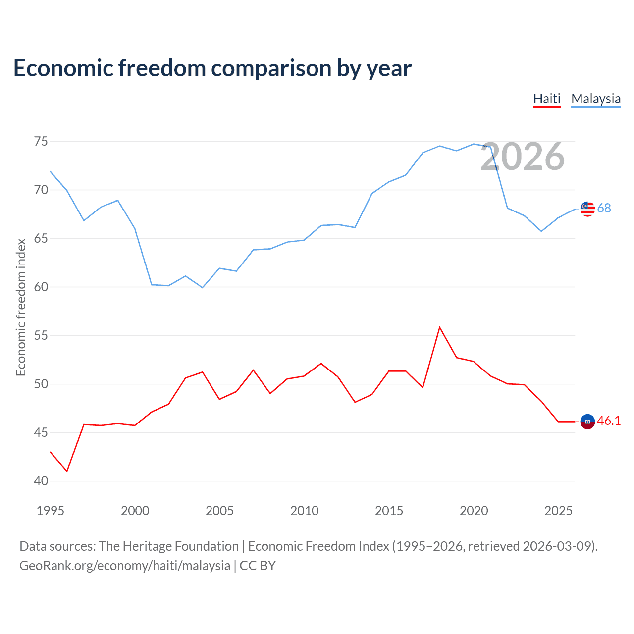 The Economic Freedom Index for Haiti is 46.1, ranking 179/197, compared to 67.1 for Malaysia, ranking 50/197. The chart below displays a comparison of annual changes in economic freedom indexes.