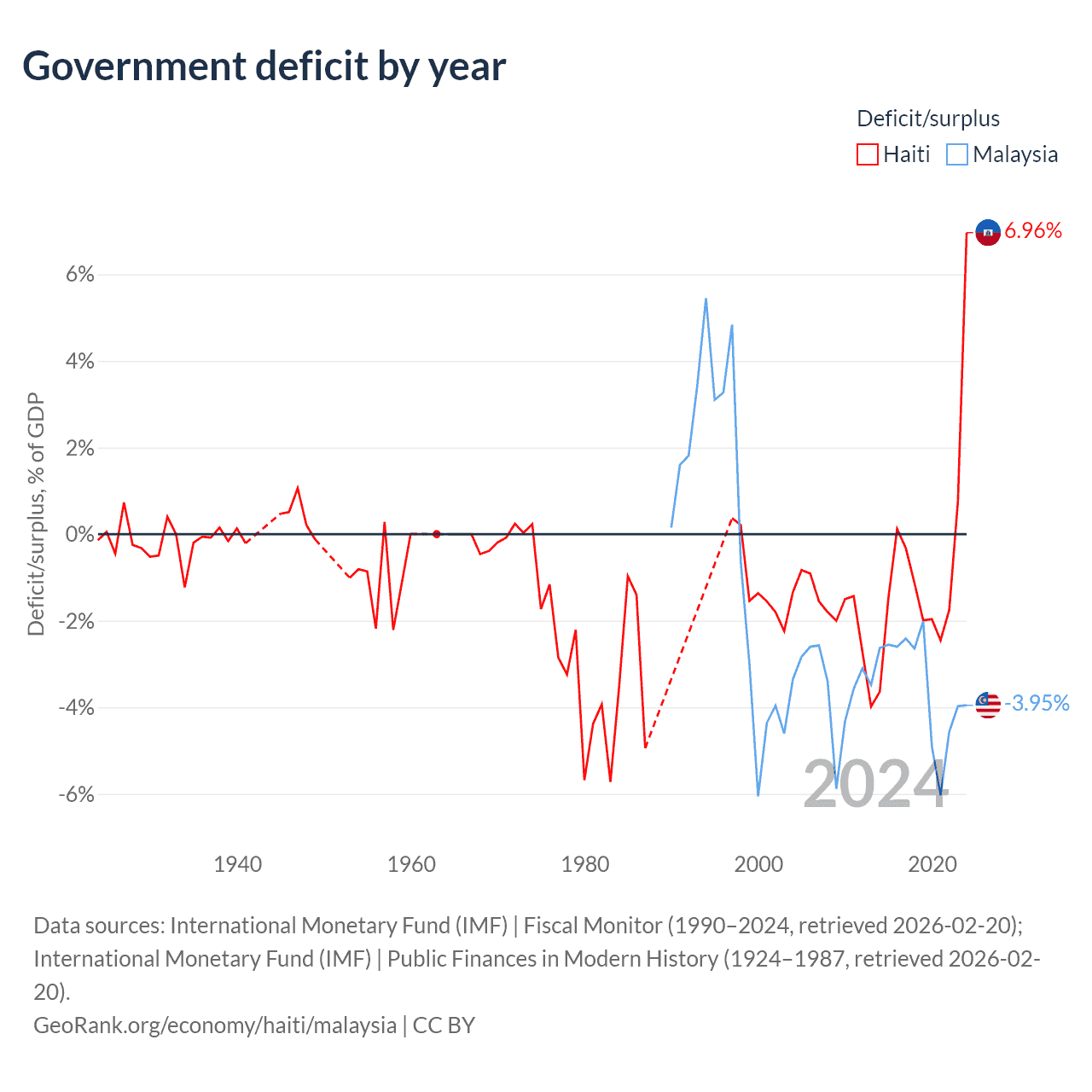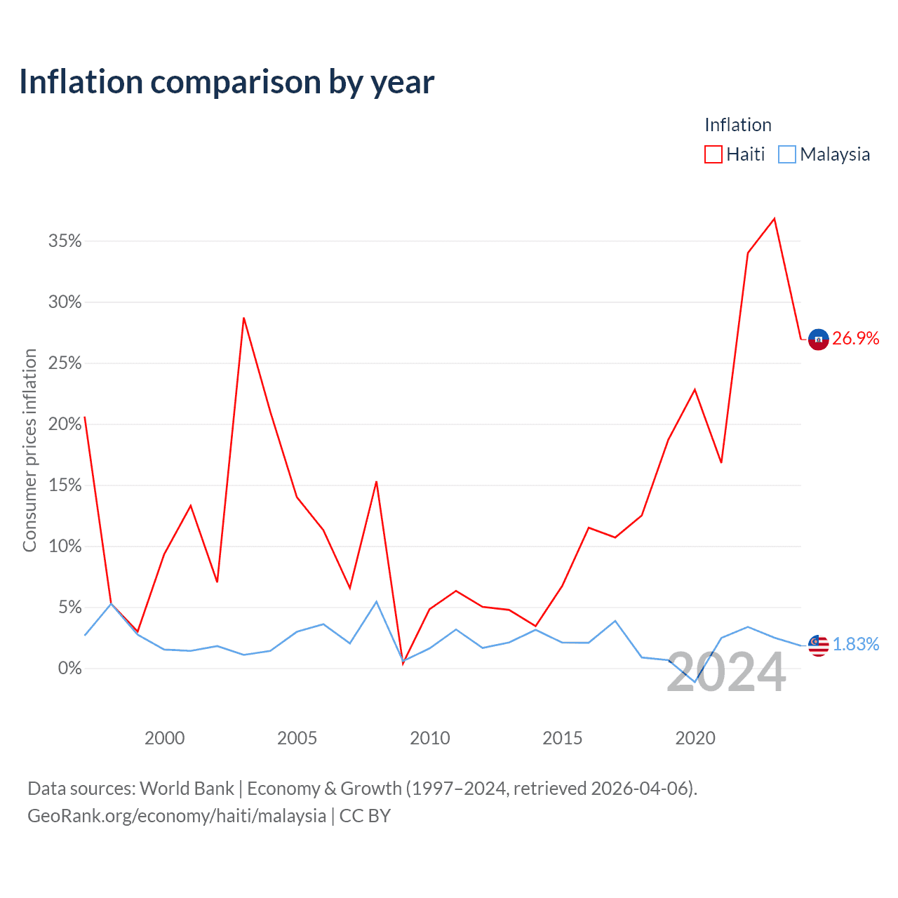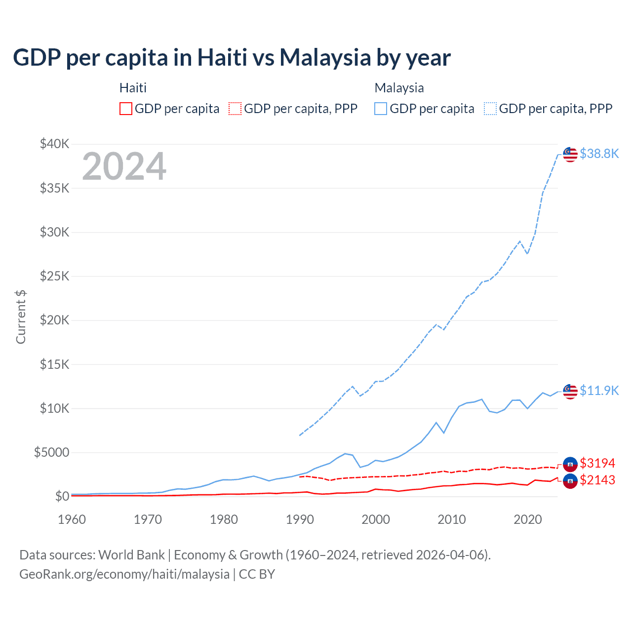 Haiti has a GDP of $25.2B compared to $422B for Malaysia, ranking 117/197 and 38/197 by economy size, respectively.