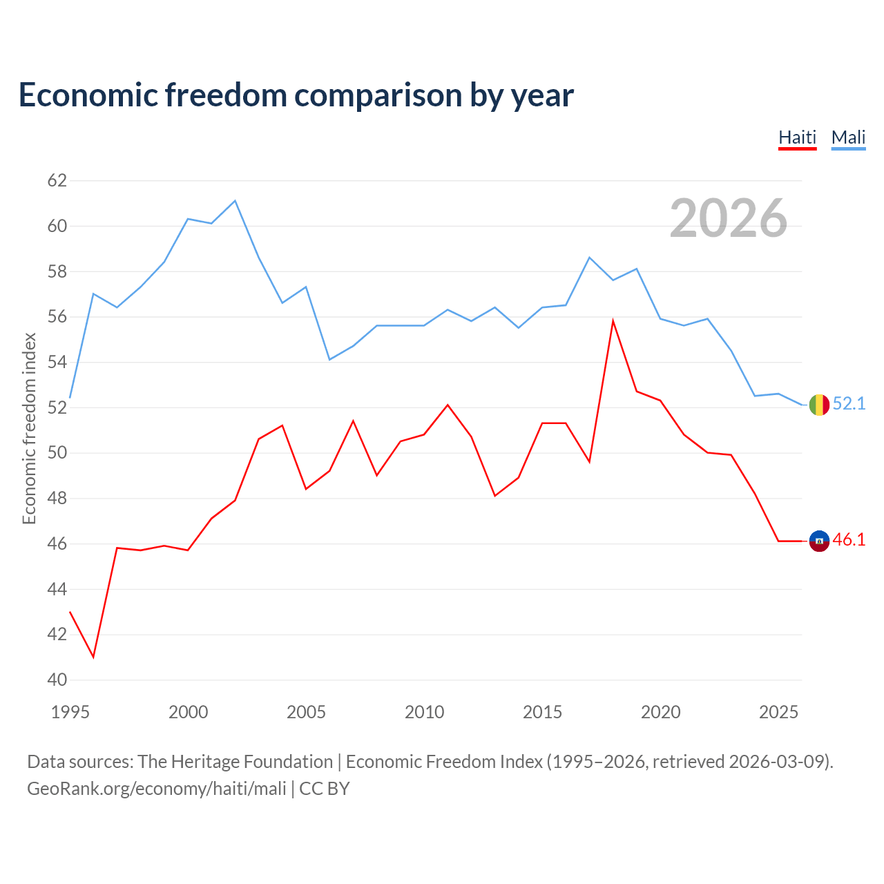 The Economic Freedom Index for Haiti is 46.1, ranking 178/197, compared to 52.1 for Mali, ranking 150/197. The chart above displays a comparison of annual changes in economic freedom indexes.