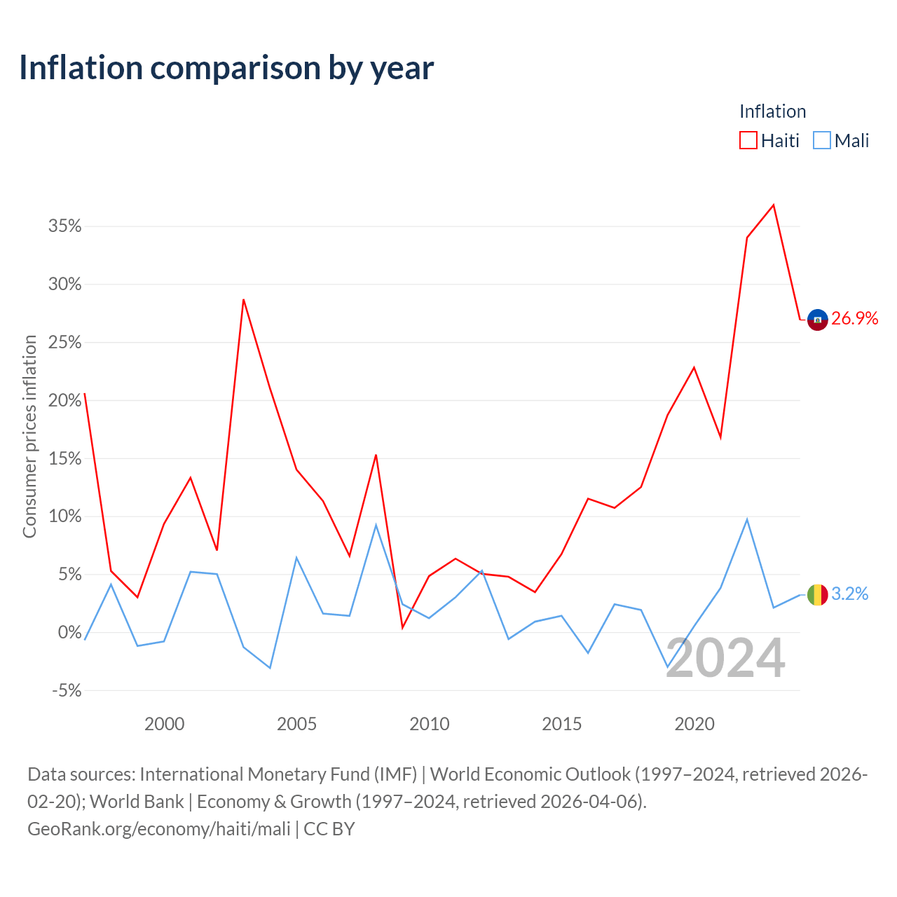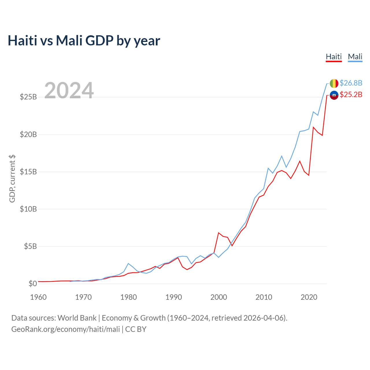 Haiti has a GDP of $25.2B compared to $26.8B for Mali, ranking 117/197 and 113/197 by economy size, respectively.