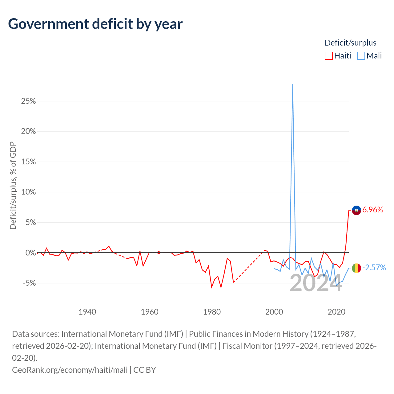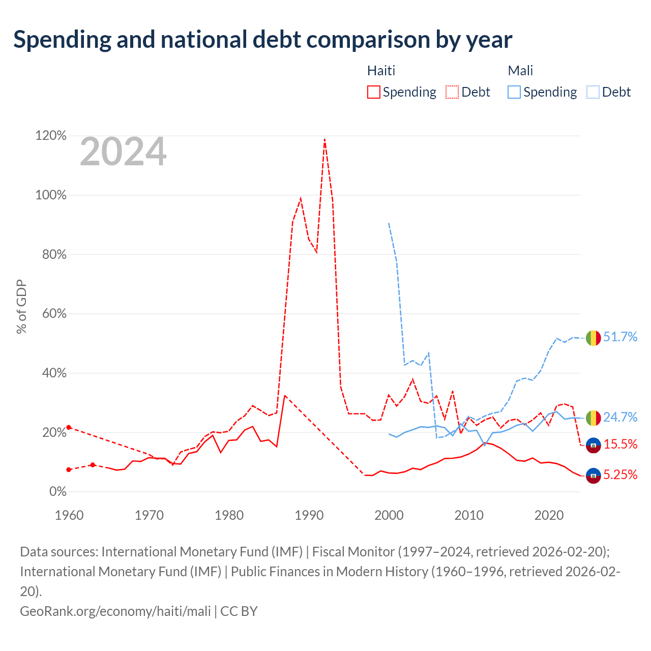 Haiti has $3.91B in government debt (15.5% of GDP), compared to $13.9B (51.7% of GDP) in Mali.
