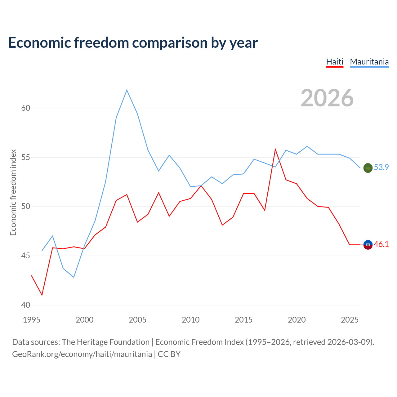 The Economic Freedom Index for Haiti is 46.1, ranking 178/197, compared to 53.9 for Mauritania, ranking 136/197. The chart above displays a comparison of annual changes in economic freedom indexes.
