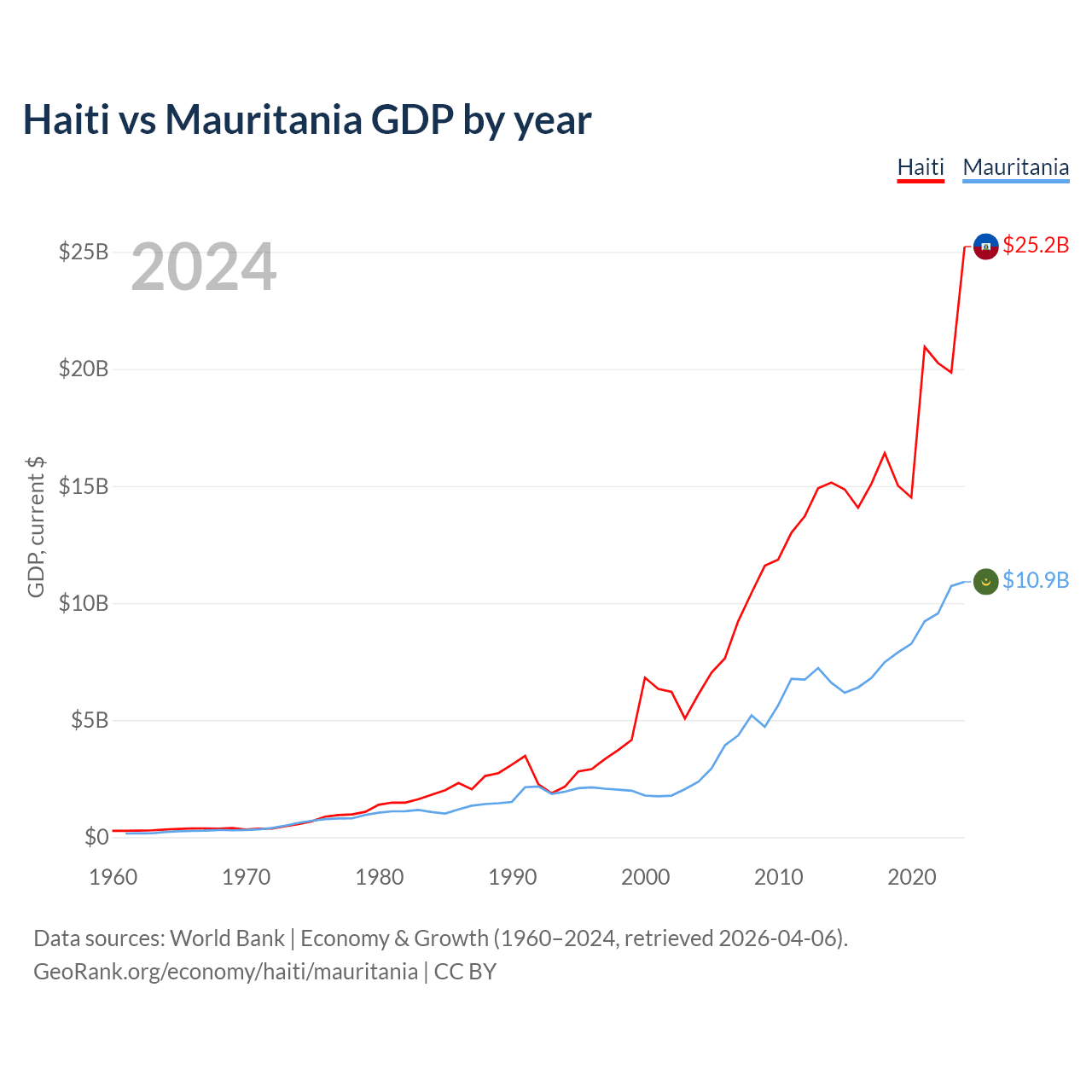 Haiti has a GDP of $25.2B compared to $10.9B for Mauritania, ranking 117/197 and 153/197 by economy size, respectively.