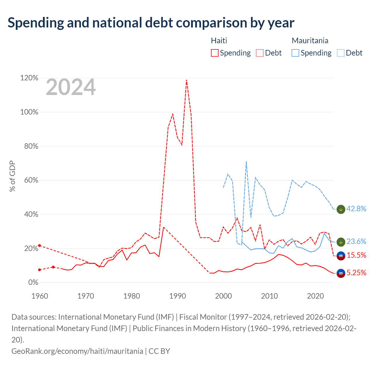 Haiti has $3.91B in government debt (15.5% of GDP), compared to $4.67B (42.8% of GDP) in Mauritania.