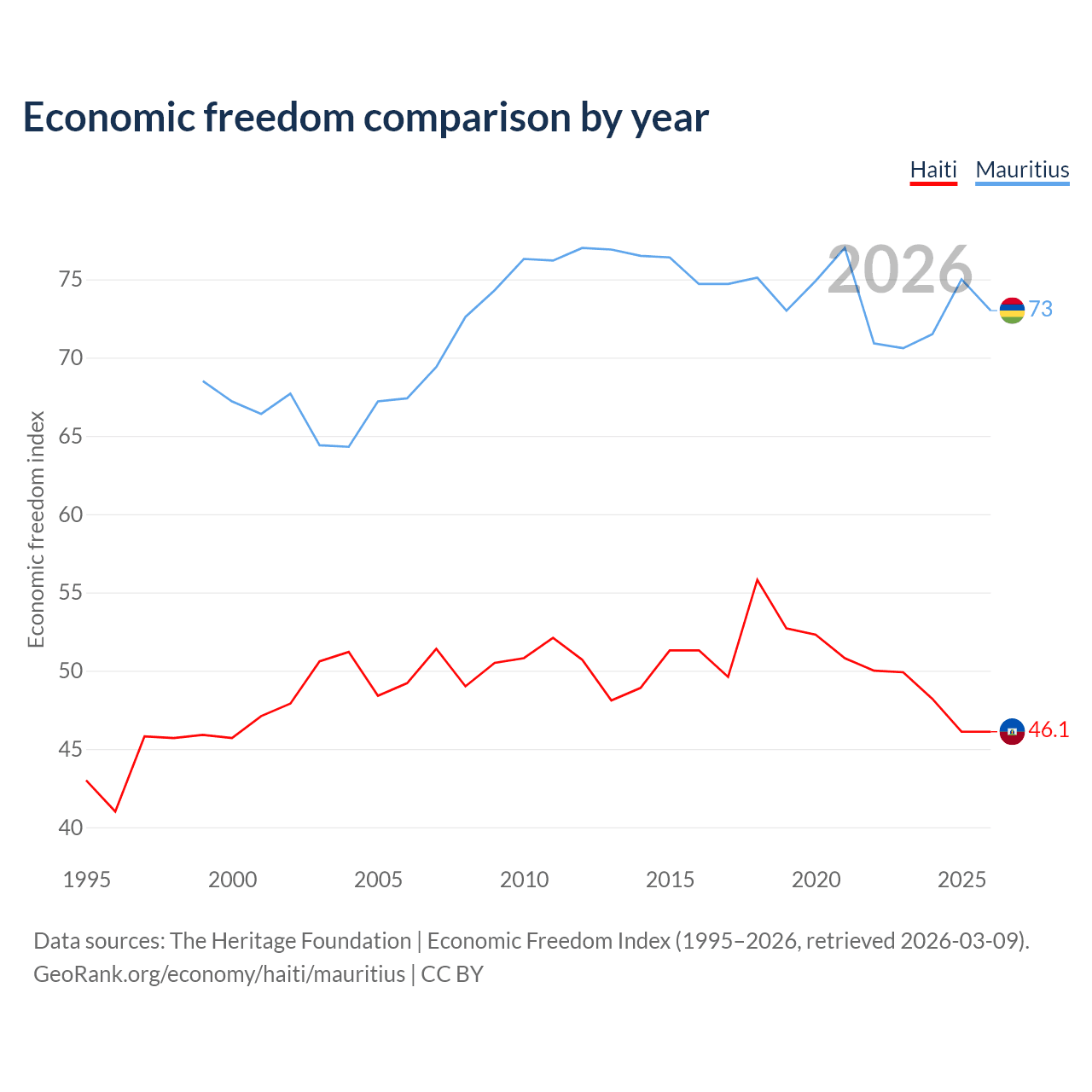 The Economic Freedom Index for Haiti is 46.1, ranking 178/197, compared to 73 for Mauritius, ranking 26/197. The chart above displays a comparison of annual changes in economic freedom indexes.