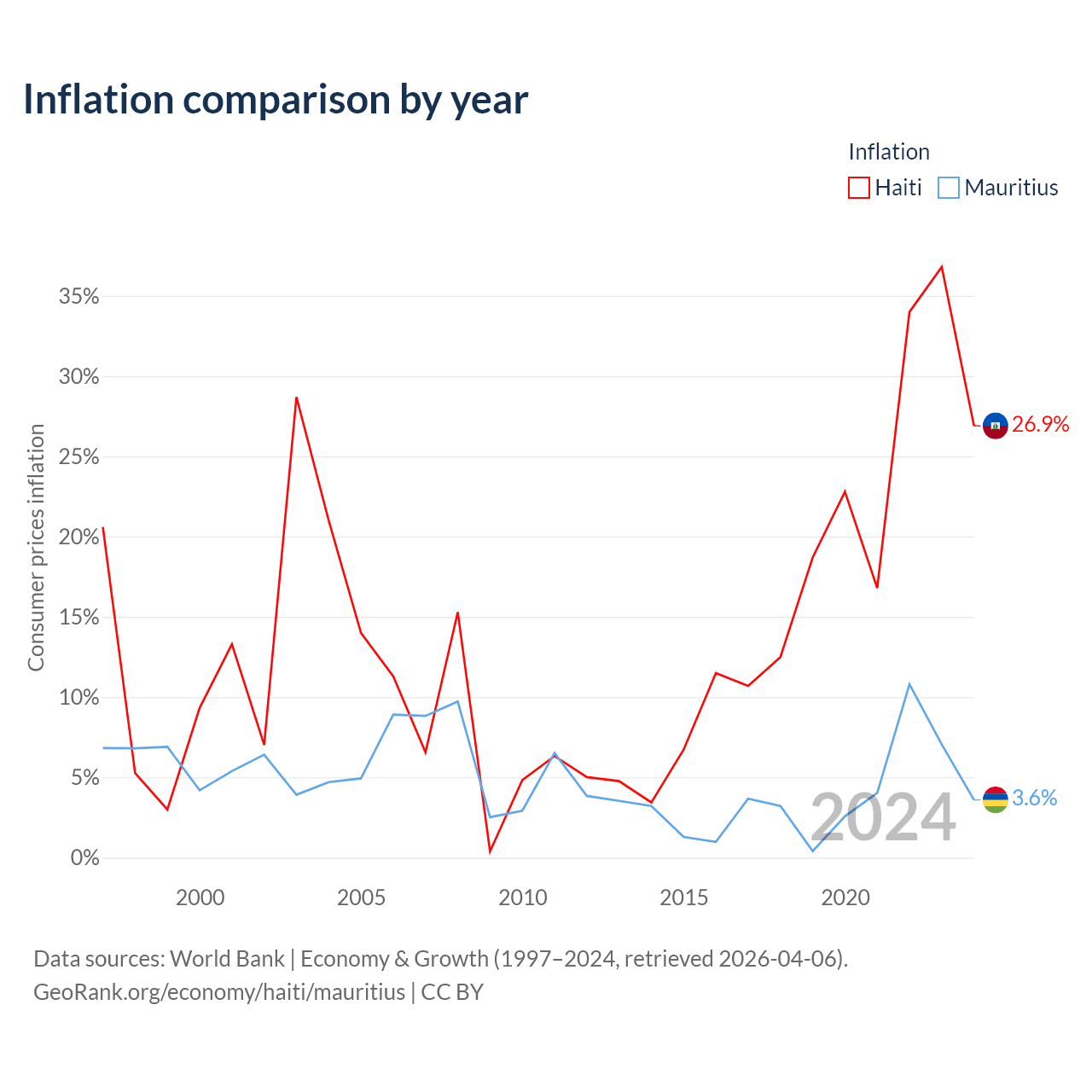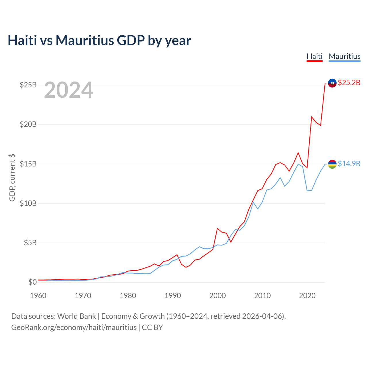 Haiti has a GDP of $25.2B compared to $14.9B for Mauritius, ranking 117/197 and 143/197 by economy size, respectively.