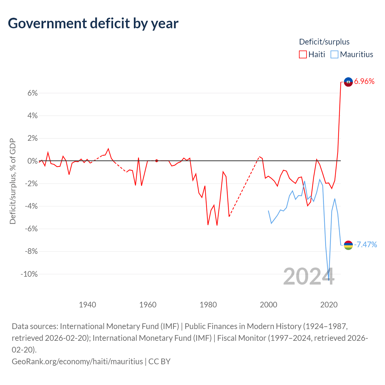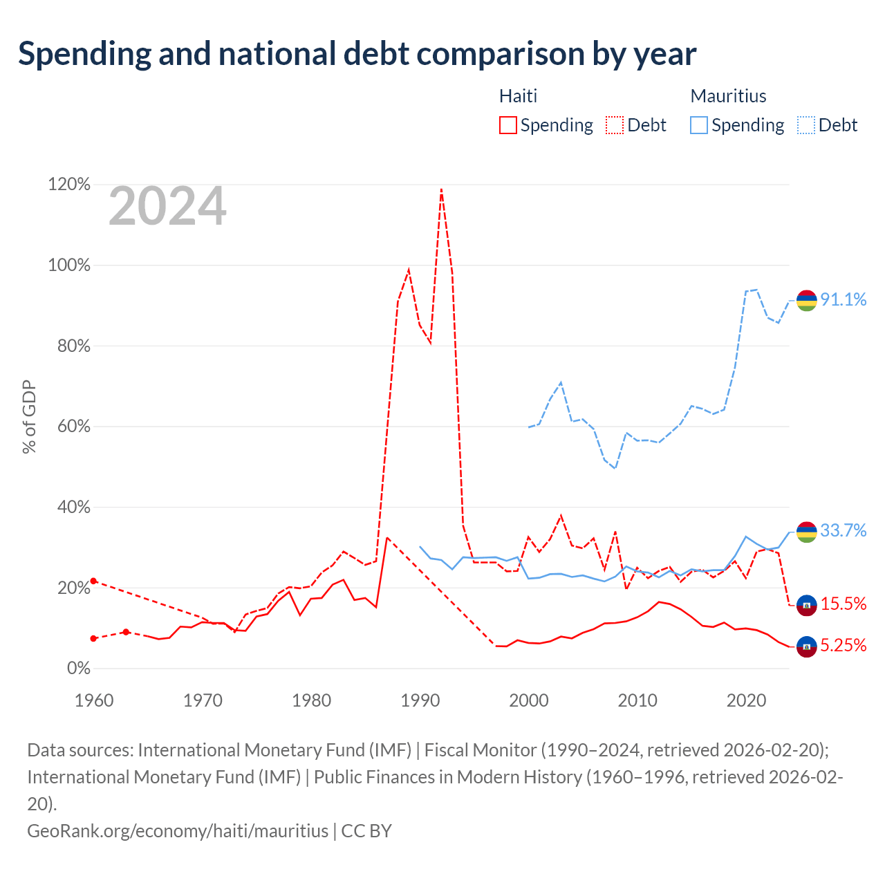 Haiti has $3.91B in government debt (15.5% of GDP), compared to $13.6B (91.1% of GDP) in Mauritius.