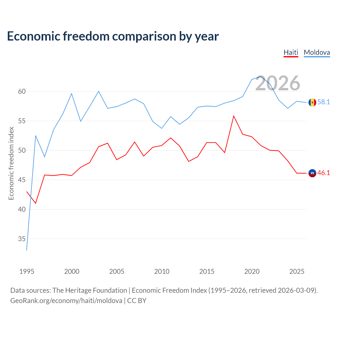 The Economic Freedom Index for Haiti is 46.1, ranking 178/197, compared to 58.1 for Moldova, ranking 112/197. The chart above displays a comparison of annual changes in economic freedom indexes.