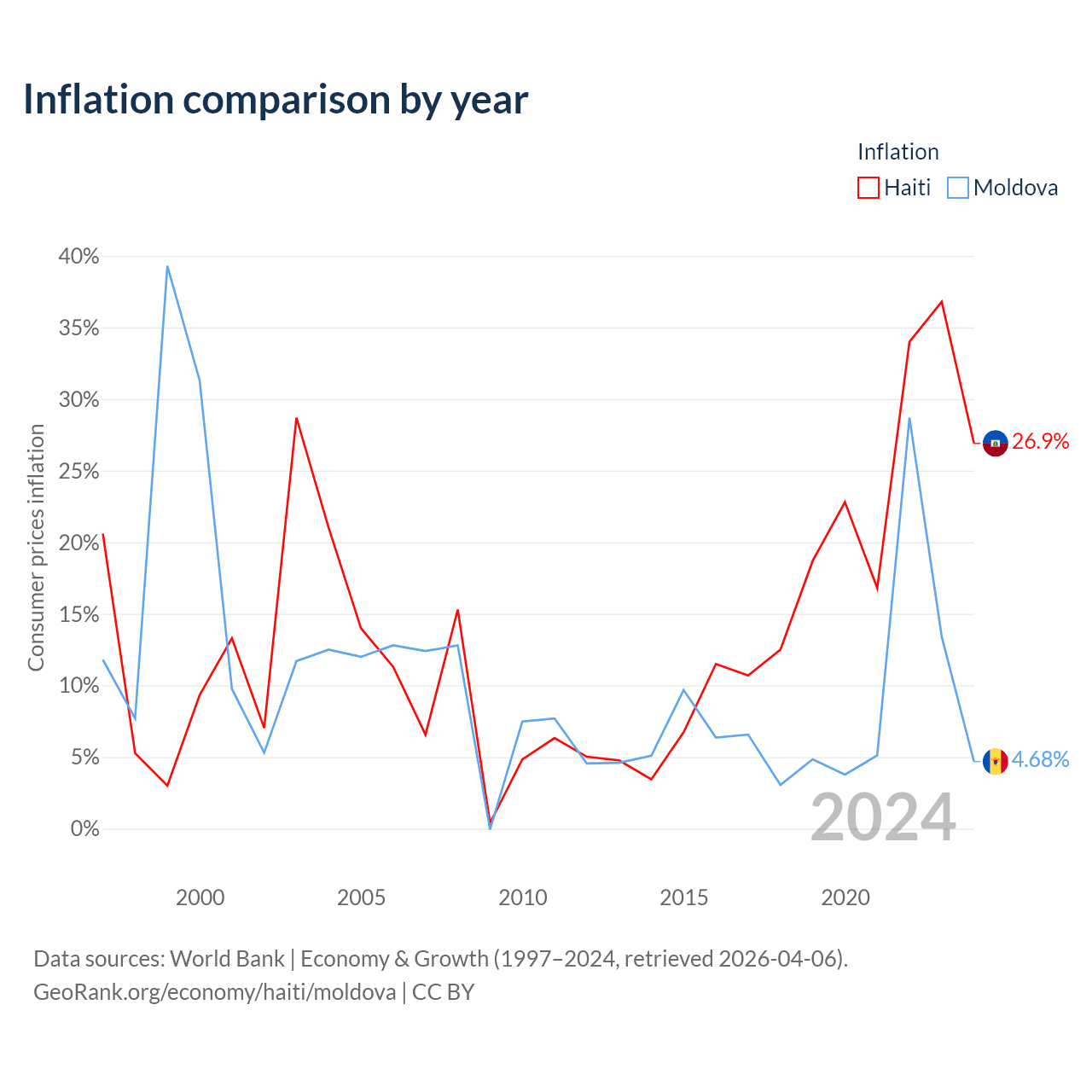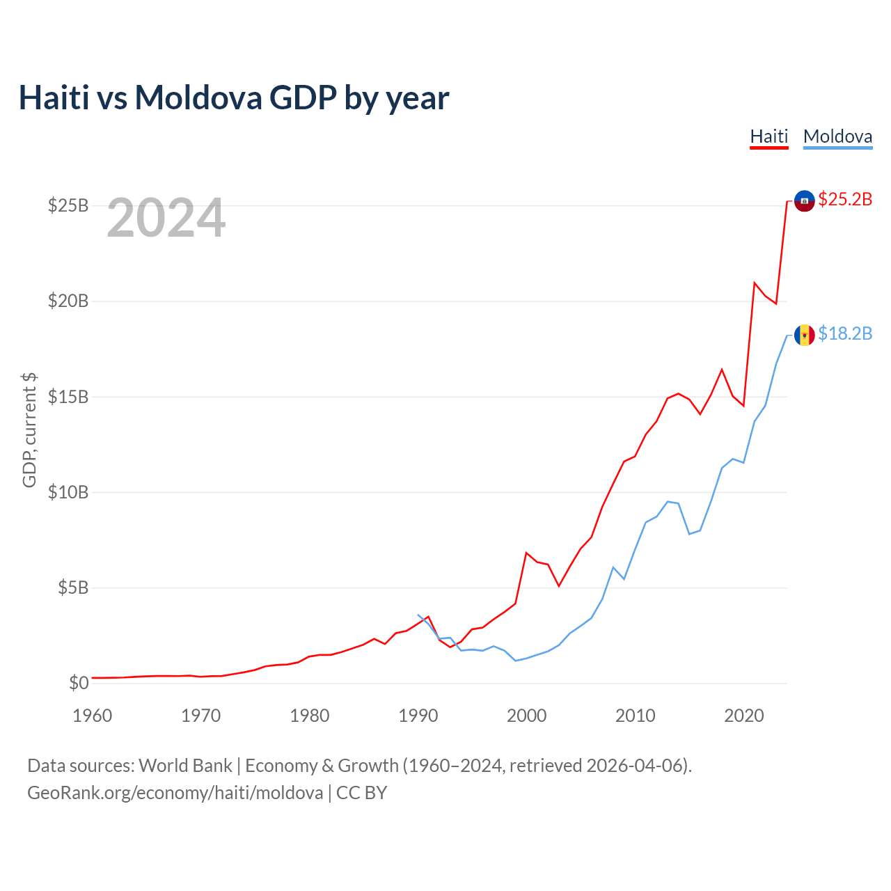 Haiti has a GDP of $25.2B compared to $18.2B for Moldova, ranking 117/197 and 134/197 by economy size, respectively.