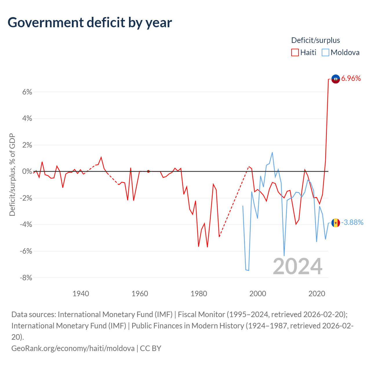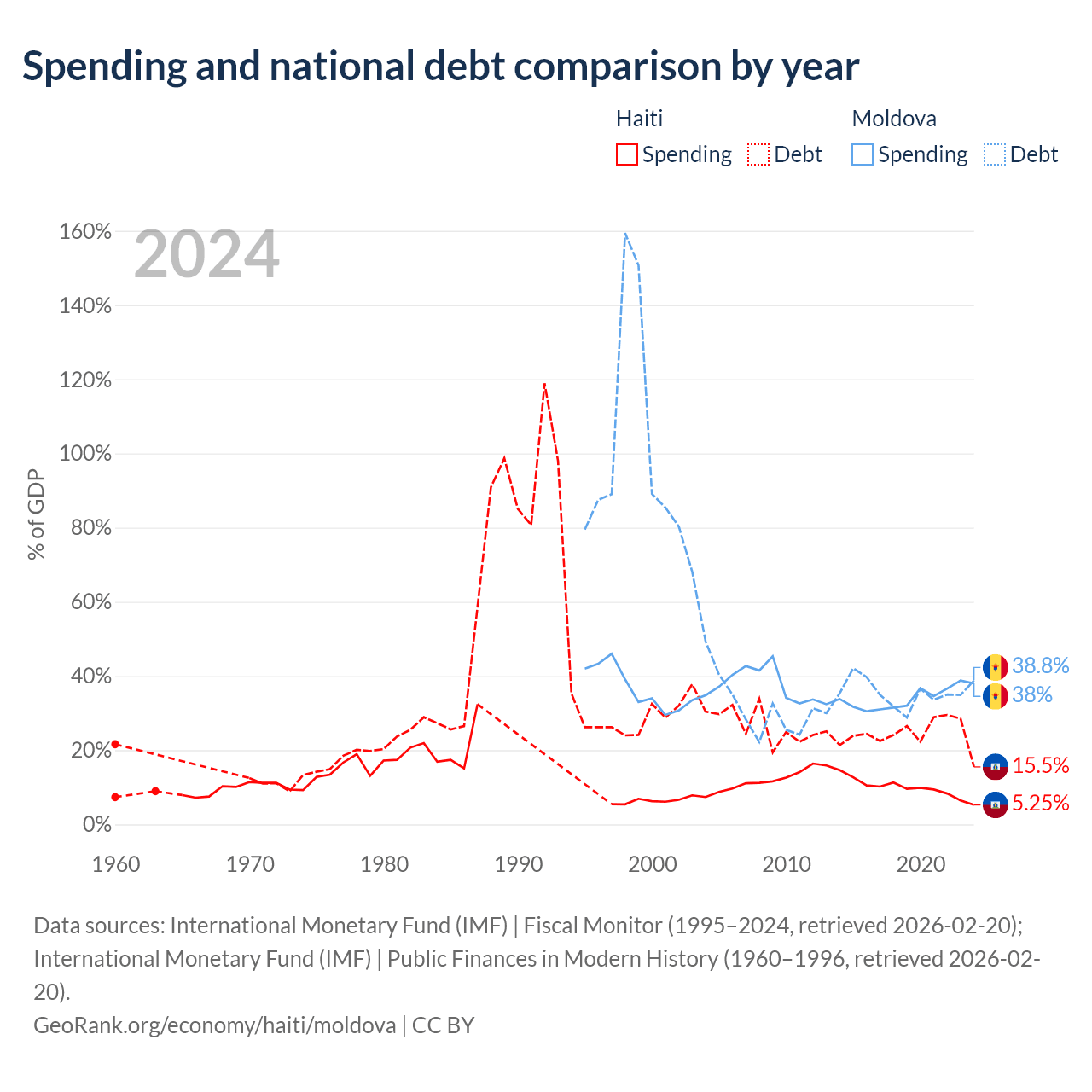 Haiti has $3.91B in government debt (15.5% of GDP), compared to $7.06B (38.8% of GDP) in Moldova.