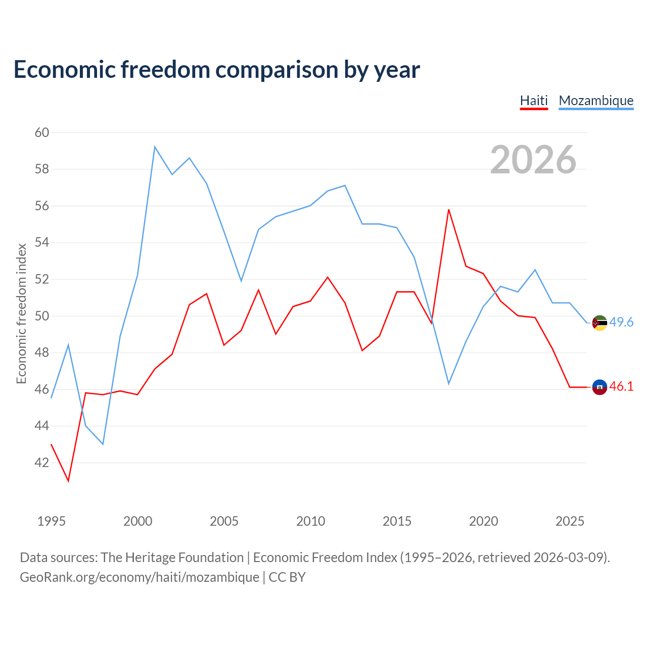 The Economic Freedom Index for Haiti is 46.1, ranking 178/197, compared to 49.6 for Mozambique, ranking 164/197. The chart above displays a comparison of annual changes in economic freedom indexes.