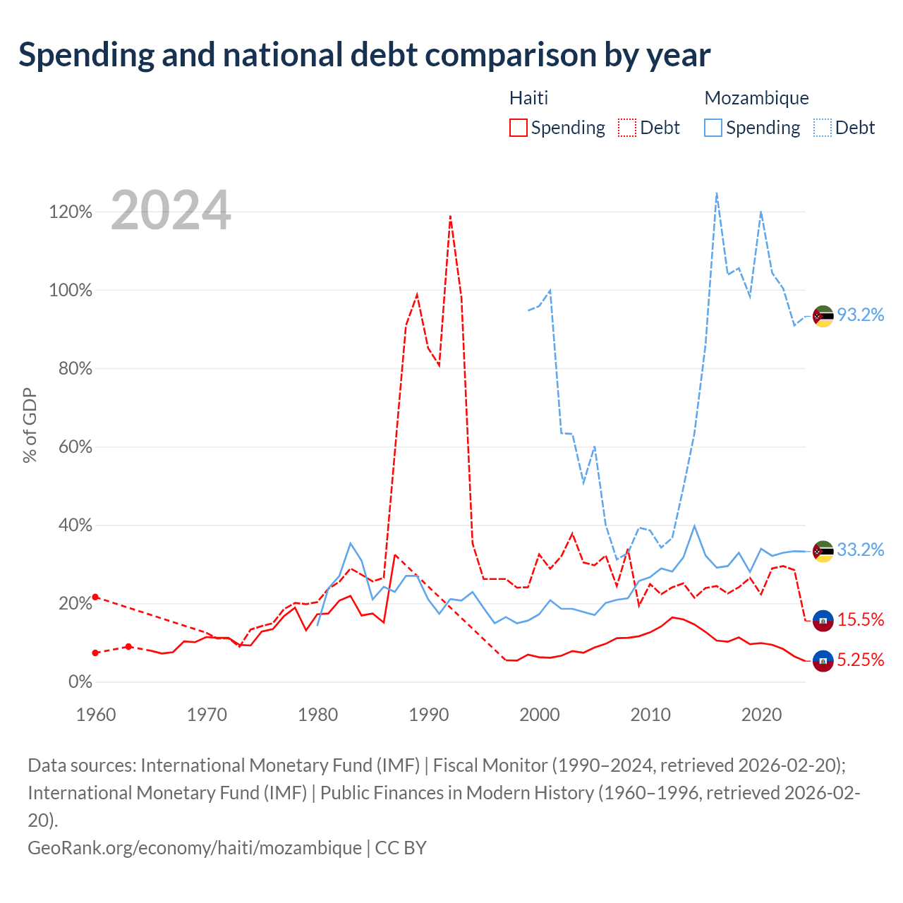 Haiti has $3.91B in government debt (15.5% of GDP), compared to $21.2B (93.2% of GDP) in Mozambique.