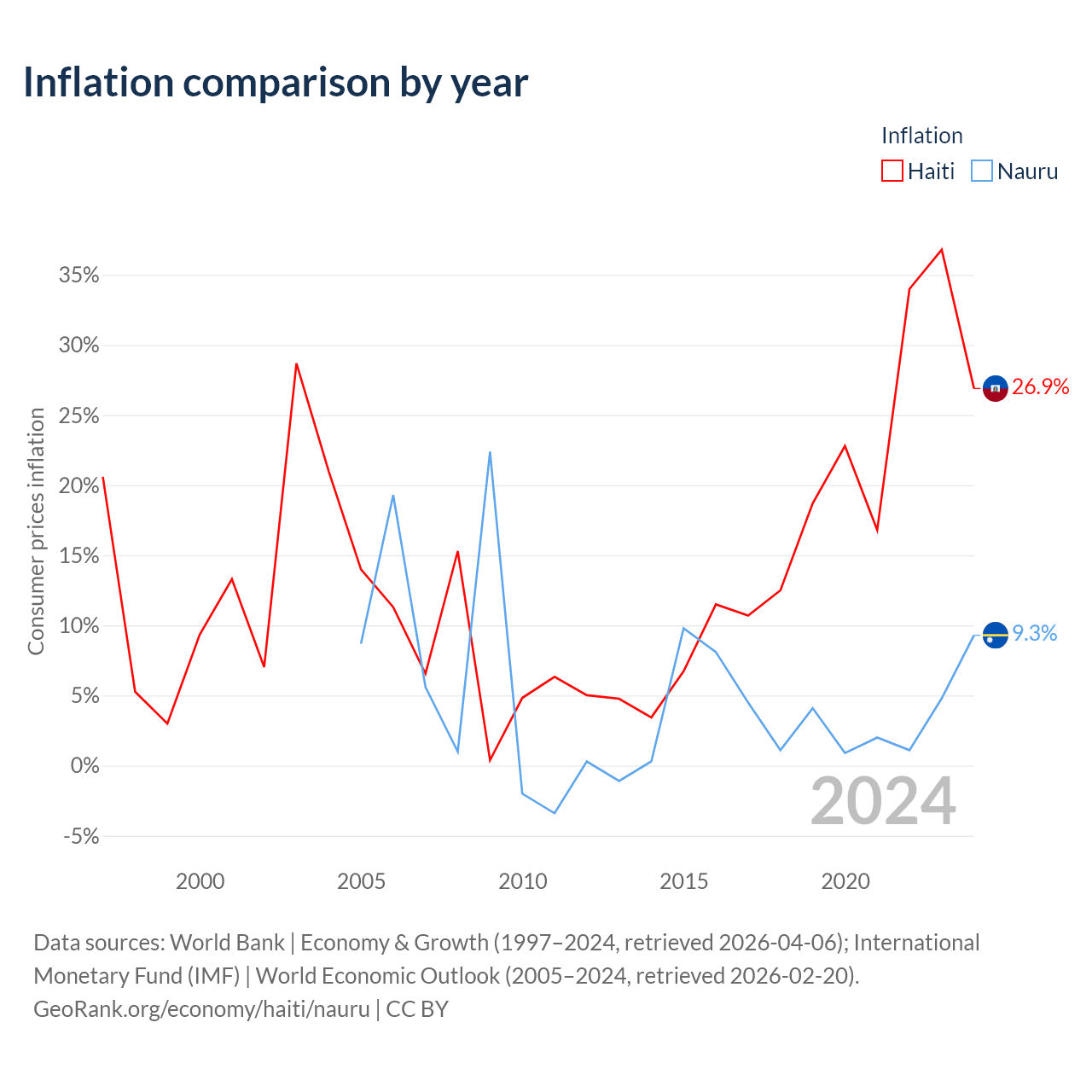 Over the past 20 years, Haiti has recorded an average annual inflation rate of 13.5%, compared with 4.84% in Nauru. In 2024, inflation was 26.9% in Haiti and 9.3% in Nauru.