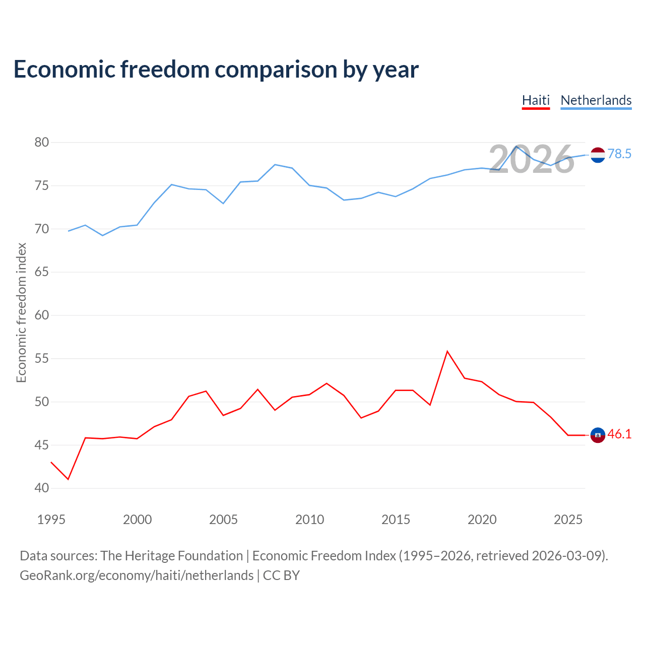 The Economic Freedom Index for Haiti is 46.1, ranking 178/197, compared to 78.5 for the Netherlands, ranking 11/197. The chart above displays a comparison of annual changes in economic freedom indexes.