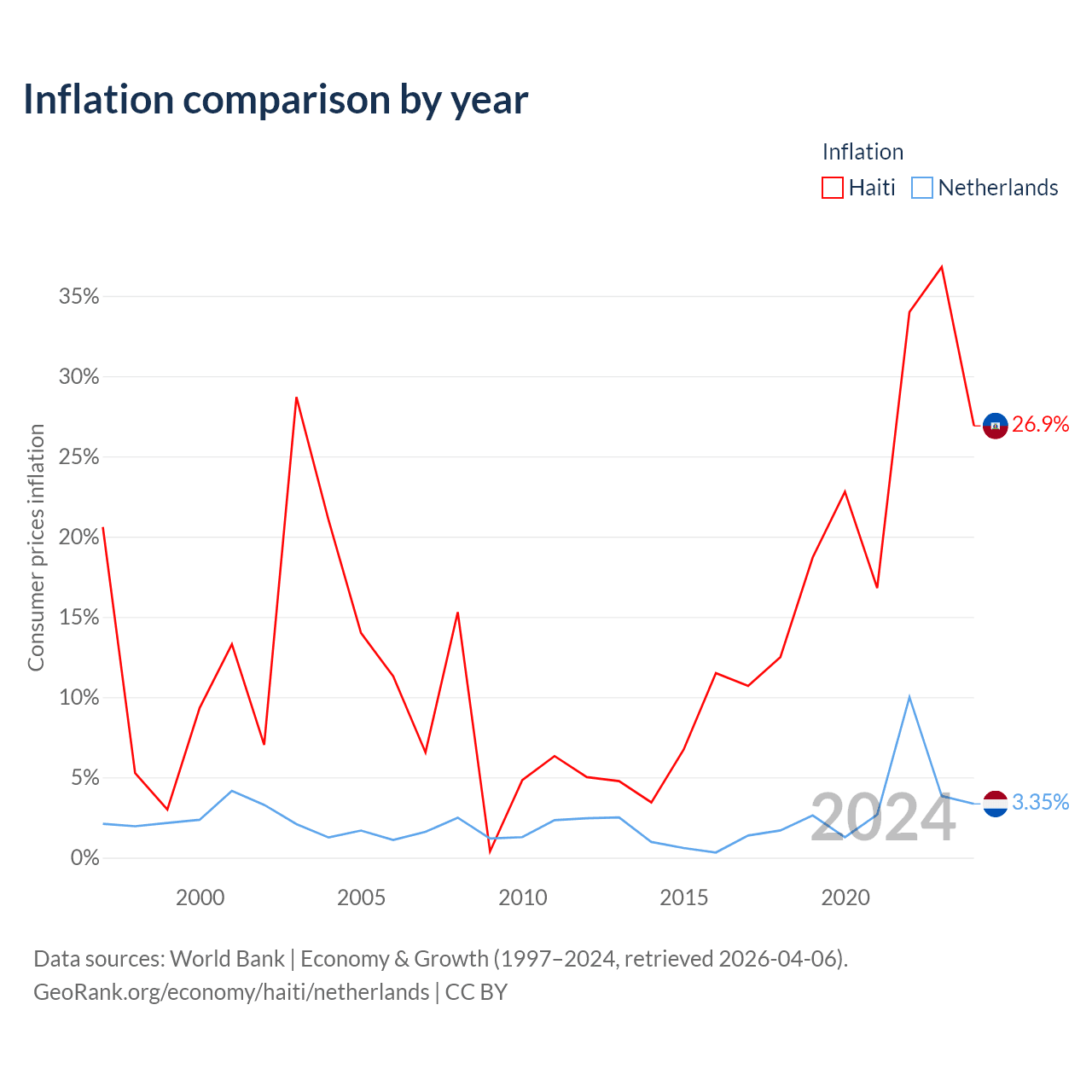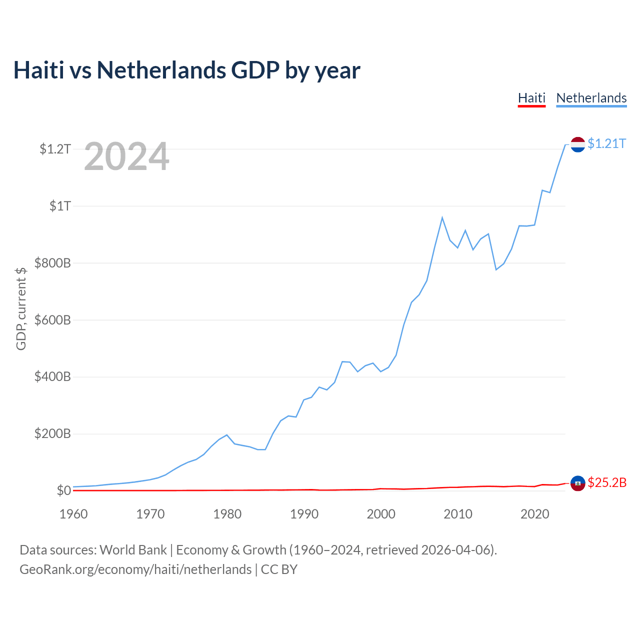 Haiti has a GDP of $25.2B compared to $1.21T for the Netherlands, ranking 117/197 and 19/197 by economy size, respectively.