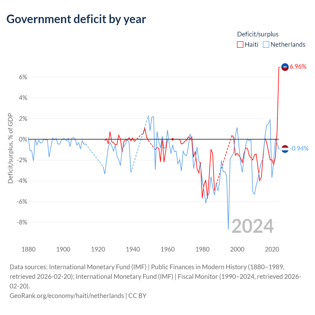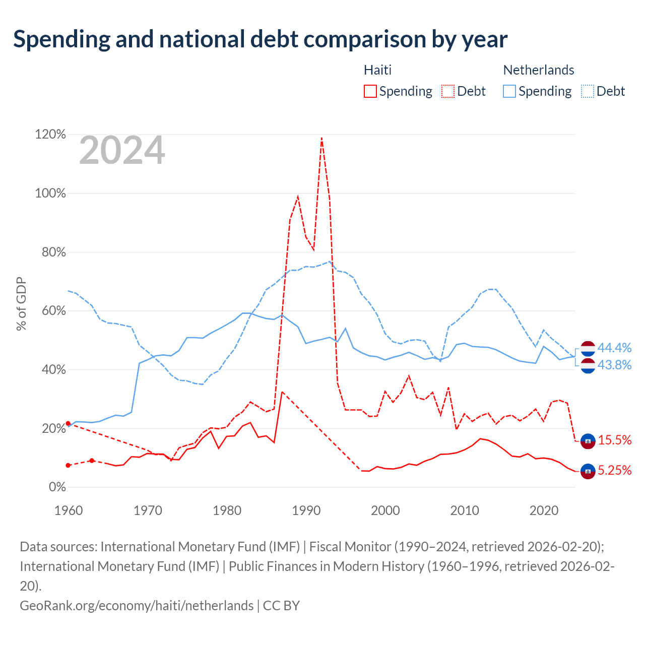 Haiti has $3.91B in government debt (15.5% of GDP), compared to $532B (43.8% of GDP) in the Netherlands.