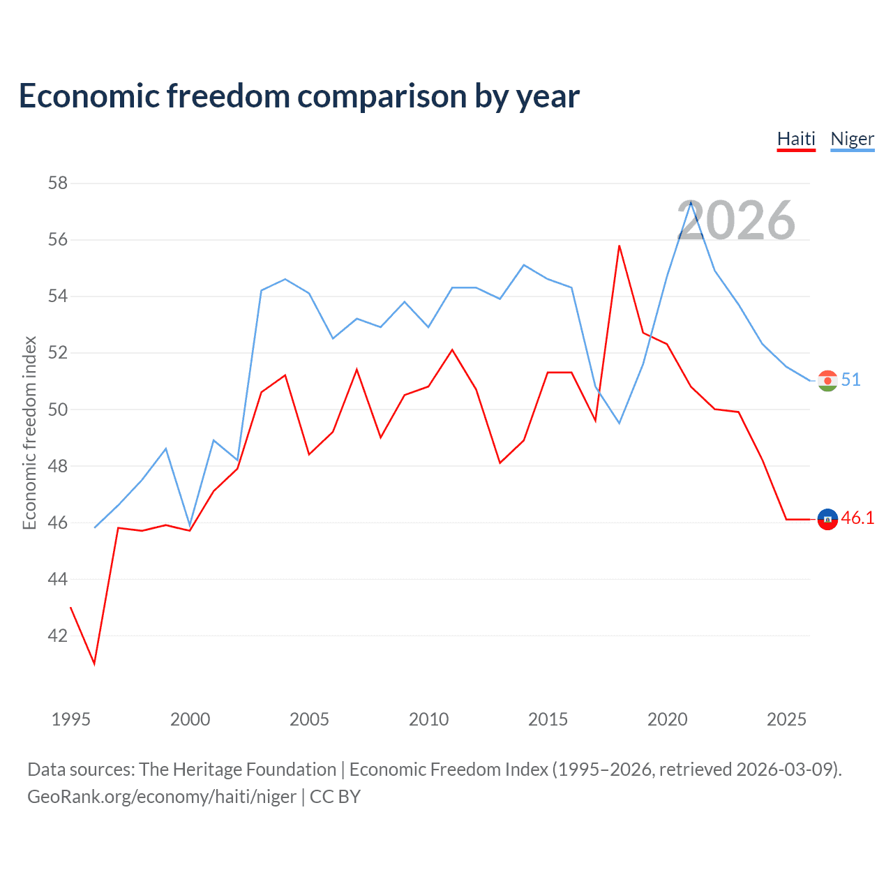 The Economic Freedom Index for Haiti is 46.1, ranking 178/197, compared to 51 for Niger, ranking 156/197. The chart above displays a comparison of annual changes in economic freedom indexes.