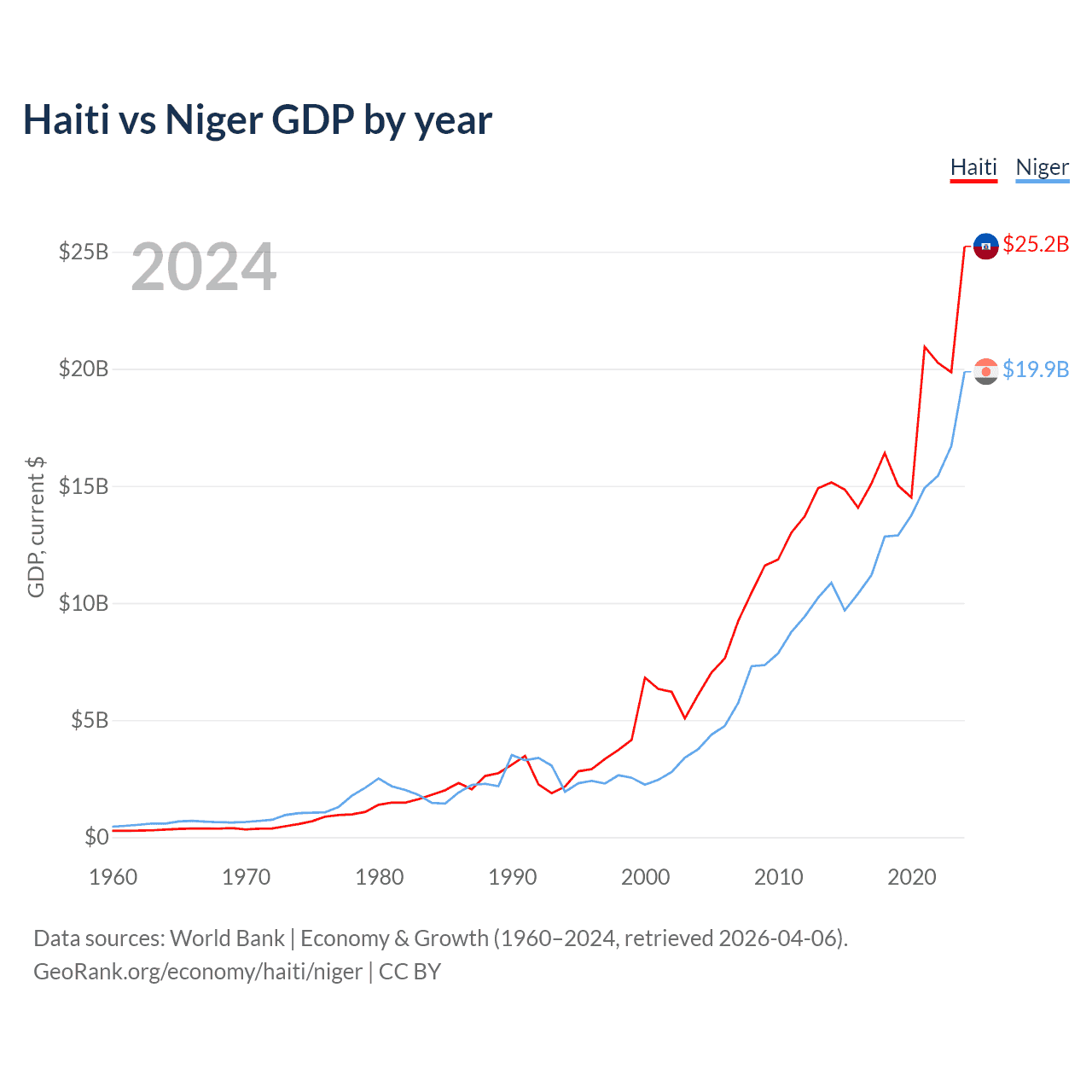 Haiti has a GDP of $25.2B compared to $19.9B for Niger, ranking 117/197 and 130/197 by economy size, respectively.
