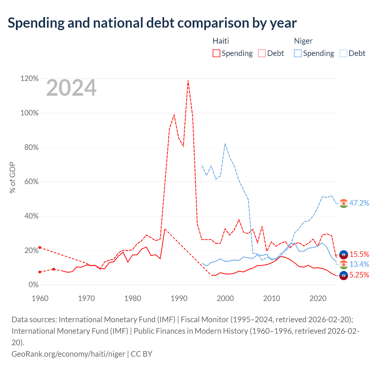 Haiti has $3.91B in government debt (15.5% of GDP), compared to $9.39B (47.2% of GDP) in Niger.
