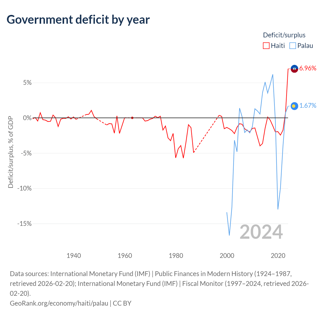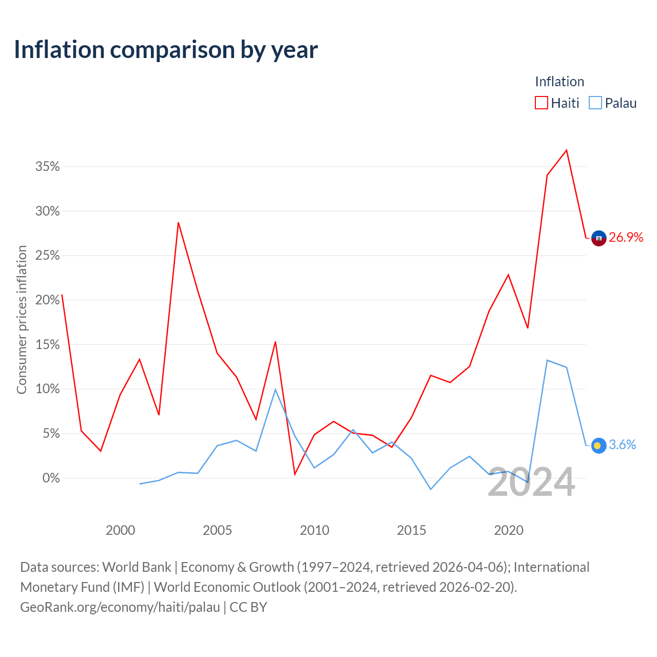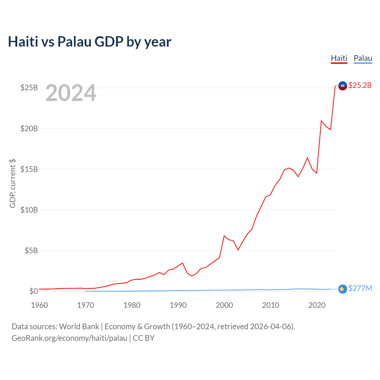 Haiti has a GDP of $25.2B compared to $277M for Palau, ranking 117/197 and 194/197 by economy size, respectively.