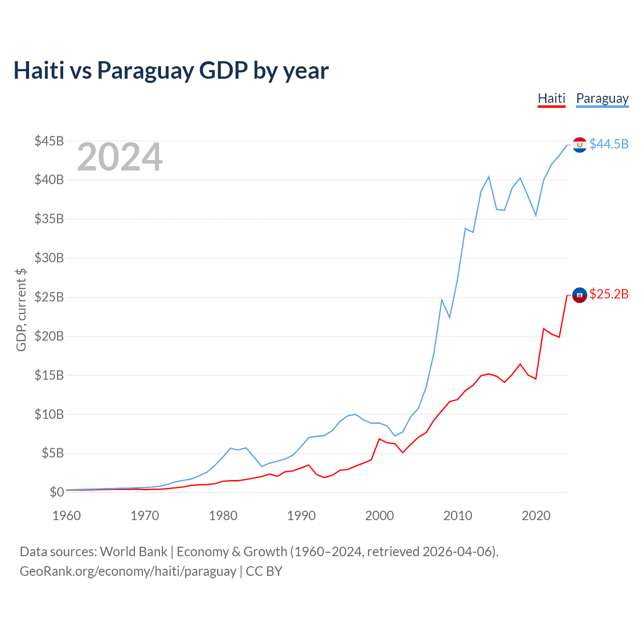 Haiti has a GDP of $25.2B compared to $44.5B for Paraguay, ranking 117/197 and 98/197 by economy size, respectively.