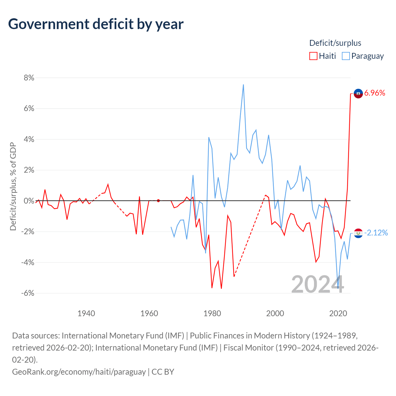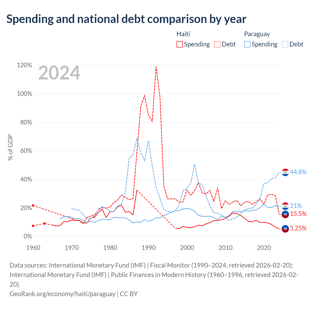 Haiti has $3.91B in government debt (15.5% of GDP), compared to $19.9B (44.8% of GDP) in Paraguay.